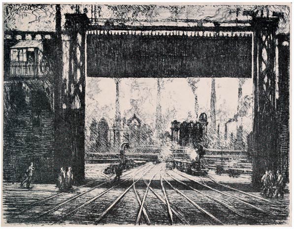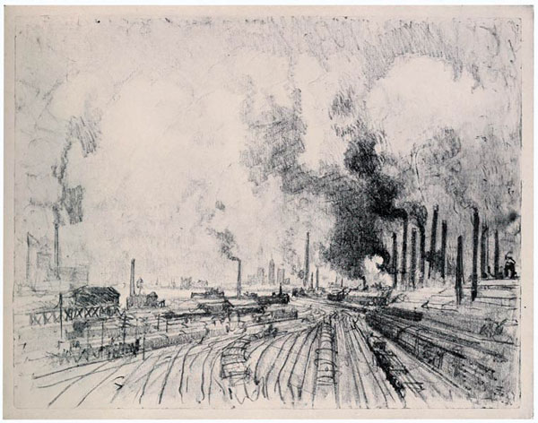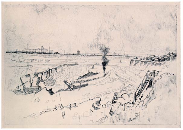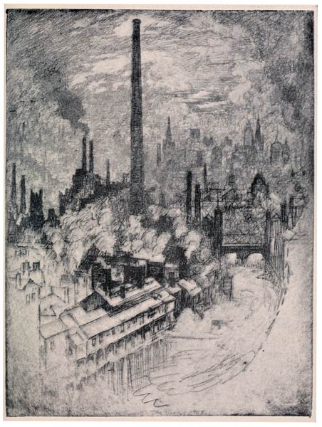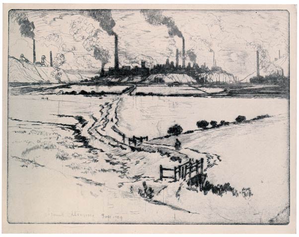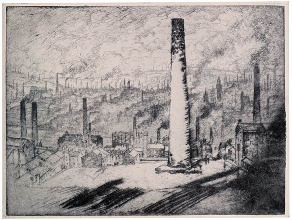 This etching illustrates, too, the necessity of doing the Wonder of Work when you find a subject, and not saying, "I will come again and do it later"—and you must find your subjects for yourself: no one can tell you where there is a fine smoke effect or a stunning steam jet. I had made the etching and later was in Bradford again and went back to look at it. Not only had it all been fenced in, but a new factory was being built round it—it had completely disappeared.