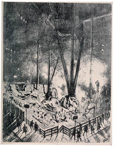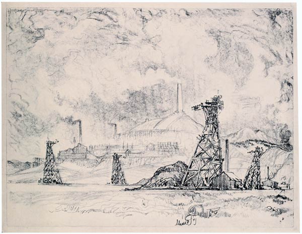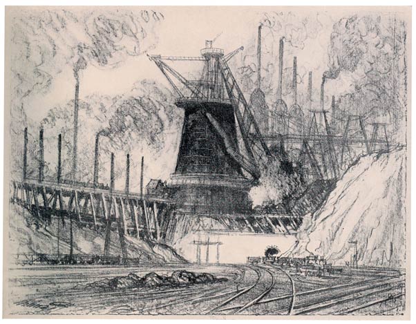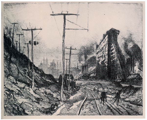 But it is to America we must turn, to White's etching of Brooklyn Bridge, Cooper's skyscrapers, Alden Weir's New York at night, Bellow's docks, Childe Hassam's high buildings, Thornton Oakley's coal breakers—to these one must look for the modern rendering of work. There are others, too, who have seen the opportunity to prig and steal—but this is evident, just as it is evident that they will give up painting or drawing work for the next new thing. And there is another artist who really cares for the Wonder of Work. I do not know what else Van Ingen has done, but he has made a huge decoration of Culebra Cut—and Paul Bartlett has put American work on the pediment of the Capitol. I have tried to do what I could in New York, Chicago, San Francisco, the coal mines of my native State—Niagara—and in Europe and at Panama; and whatever their worth, I can only tell of the Wonder of Work as I see it.