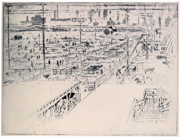 The lines of the pens or corrals, or whatever they are called, are fascinating to draw—and fascinating it is to watch the picadors, or cowboys, or whatever you call them, rounding up the cattle, and all the lines of the design lead up to the packing-houses which fill the distance. I have never been in them, don't want to go, and have no interest in the social, financial, or sanitary condition of them. I am always being criticised for lacking interest in such matters, but my critics do not realize I am simply an artist searching for the Wonder of Work—not for morals—political economy—stories of sweating—the crime of ugliness. I am trying to record the Wonder of Work as I see it, that is all.