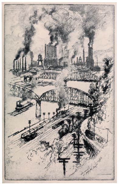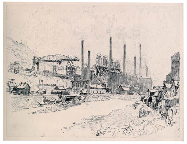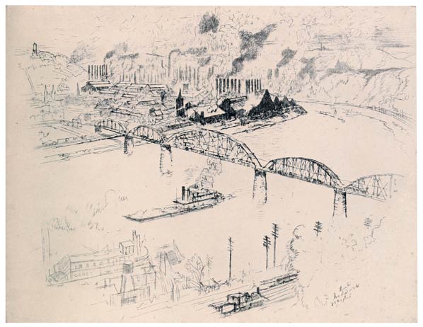 In the works at Homestead what interested me was the way the mills lie under the hills on the curving river, the way that winds up to them, the way the graceful iron bridges span it, and the deep-sighing steamboats push the barges up and down; the way the clouds mingle with the smoke—the composition that is there.