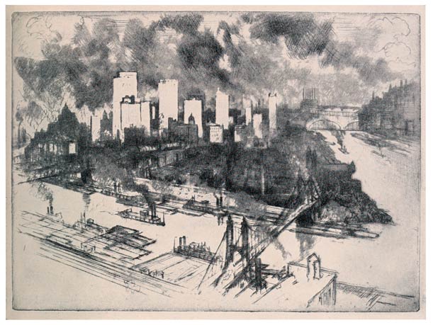 Way down below the level road on which I stood, way on the opposite side of the river, Pittsburgh lies a dark, low mass, hemmed in by its rivers, lorded by its hills; in the hollow the smoke hangs so dense often I could not see the city at all, but once in a while a breeze falls on the town, and the great white skyscrapers come forth from the thick, black cloud, and the effect is glorious—the glorification of Work, for Pittsburgh is the work-city of the world.