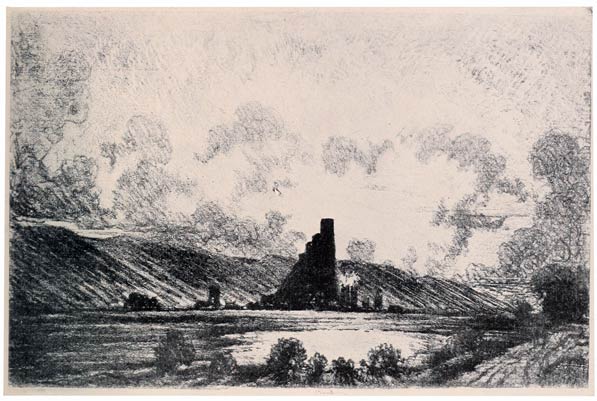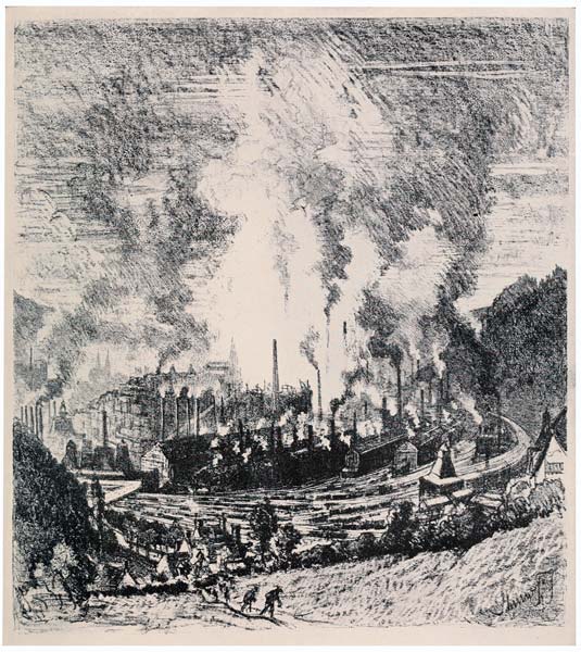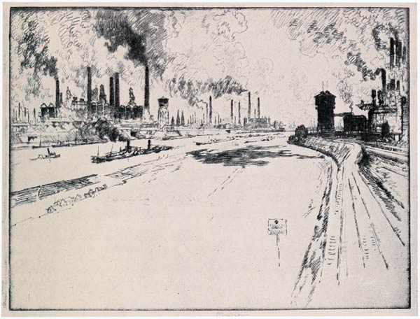 If either you have the brains, or it is clear enough, you can see this great stack dominating the whole landscape and townscape as you come out of the railroad station at Sheffield. A great American literary person actually saw it and regretted, on an editorial page, that no artist ever looked at such subjects; but when I not only wrote him that I had etched it already and sent him a proof to prove it, he never acknowledged my letter, but he kept the proof. I may say that in 1883 I made a series of illustrations of work subjects in Sheffield which were printed in Harper's Magazine. Two things always impressed me in that town—the boiling water in the rivers and the abominable habits of the natives in the streets, who from across the rivers and behind walls and other safe places "'eave arf a brick" at you if you dare to draw.