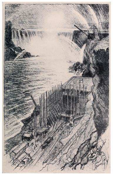 The purists and the theorists have made a great fuss about the destruction of the Falls and the vandals who have done it. Now the Falls, I believe, have not been lowered an inch, and as for the power-houses, they are most of them Greek temples, and placed just where the Greeks would have placed them. For once the Greek temple is right in America, and therefore the American purist and theorist doesn't like it—he would not have liked Greek temples had he been Greek. I did not draw the temples, but the temples being built, which was interesting. Below the bridge on the American side are older works, wondrous works, high on the cliffs, great overflows of water gushing from the rock. If they were in Tivoli the purists would sit down between two trains and snapshot the "cute" Villa d'Else and the "hansome" Villa of Hadrian, or revile the spaghetti, while a courier quoted Baedeker at them. At Niagara they take off their clothes, put their feet on the piazza rail of the Canadian hotel, sigh over the power-houses, delight in ginger-ale, and forget the Falls, in the pages of a Saturday Home Magazine. This lithograph is a proof that engineers design to-day for companies, not churches.