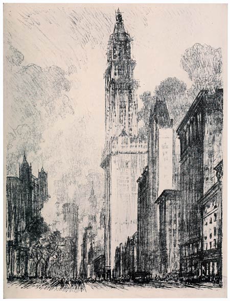 Here is a moody colossus—sometimes it is fine, sometimes filthy. It was all right the day I made this drawing, stately amid the clouds. One thing it has done—it has made a new sky line and brought New York together again. It comes up best from the river, but no longer do the Brooklyn river-boats run; from them I used to get the best views. Still, there are other ways of seeing the Wonder of Work even now at New York.
