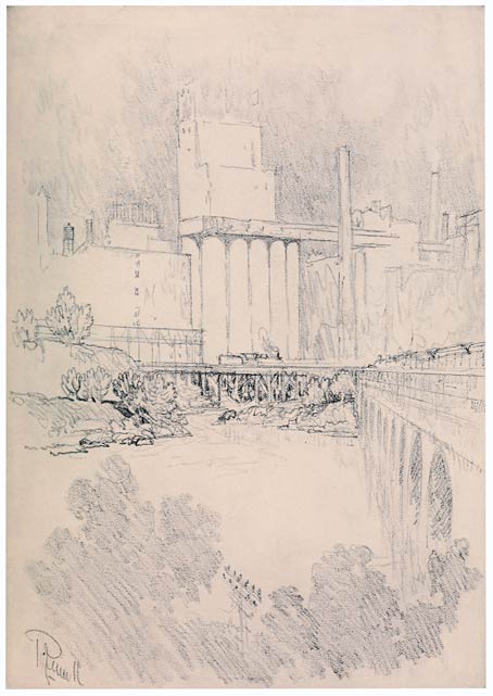 The mills of Minneapolis are as impressive as the cathedrals of France. There are places on the river where they group themselves into the same compositions, with the bridges below them, that I found years ago at Albi—only the color is different: the rosy red of the French brick is changed to dull concrete gray. The tree masses below are the same, and the old stone railroad bridge over the Mississippi is just as drawable as that over the Tarn. The beauty of the flour mills is the beauty of use—they carry out William Morris's theory that "everything useful should be beautiful"—but I don't know what he would have said to them. There are other subjects which recall Tivoli, where the streams gush out from the bluffs or tumble and rush and roar from dark caverns between the huge modern masses of masonry as finely as they do in far-away Italy. Those were the shrines of the gods—these are the temples of work, the temples of our time.