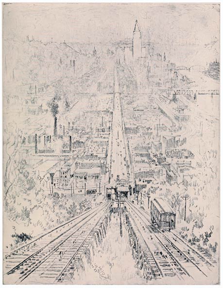 There are hundreds of these inclines—ascenseurs, finiculari, in the world—all fascinating from above or below—but I know of none so fascinating as this even among the numbers at Cincinnati—none in which the pitch is steeper, the stop so sudden—none where the streets lead direct to the heart of the city; no city so dominated, concentrated, at its heart, by its lone white skyscraper, as Cincinnati. That is why I drew it; and, as I drew, the boy who opened and shut the gates came and told me he wanted to be a poet, that he was a poet, and that Poe was the greatest American author, which most great Americans do not know, and that he loved Shelley, and so I recommended Whitman to him, of whom he had not heard, and advised him to attend to his gates and his poetry and then he might do something. And he asked me if I had done anything myself. If I had made good! Well, have I?