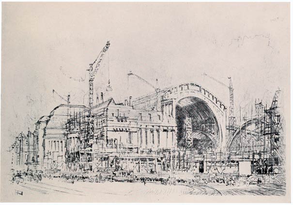 I believe this station is larger—it is certainly far better designed than anything in America—but the building of it, with the great, half-finished arches looming up, was a splendid motive. I was in Leipzig in April, 1914, drew this; I returned in June and the subject was gone; all that remained was the Graphic Art and Book Exhibition, the finest ever held anywhere. And that was ruined by the fools who brought on the fool war.