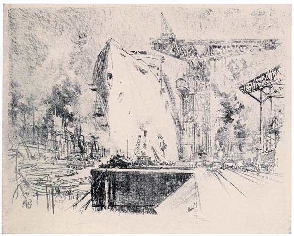 I believe the Bismarck is the biggest ship—or the biggest German ship—yet launched; the crane beside her is the biggest and the most wonderfully controlled I have ever seen anywhere, and the whole made a composition as fine as anything in the Wonder of Work.