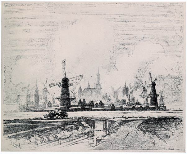 Rembrandt saw that his father's mill was beautiful, and by his renderings of the windmills and the dykes of Holland proved them the great works of his little country, and showed they were pictorial. And he drew, etched and painted them because he loved their big powerful forms, their splendid sails, the way they lorded the land and kept out the sea. They were for him the Wonder of Work, the wondrous works of his time, the works that were all about him. So strong and so powerful were these Dutch works that they have lasted till to-day, and so well were they designed that all windmills and watermills have kept their form till now. The working parts have possibly been improved, but the design has not been changed, and Rembrandt's etchings—so accurately drawn they would serve as working models—prove it. And yet Rembrandt has made a perfect artistic composition as well as a true mechanical rendering of these mills and dykes. And as Whistler said in the "Ten O'clock," the Bible of Art, Rembrandt regretted not that the Jews of the Ghetto were not Greeks, nor—may I add?—did he regret the windmills were not temples.