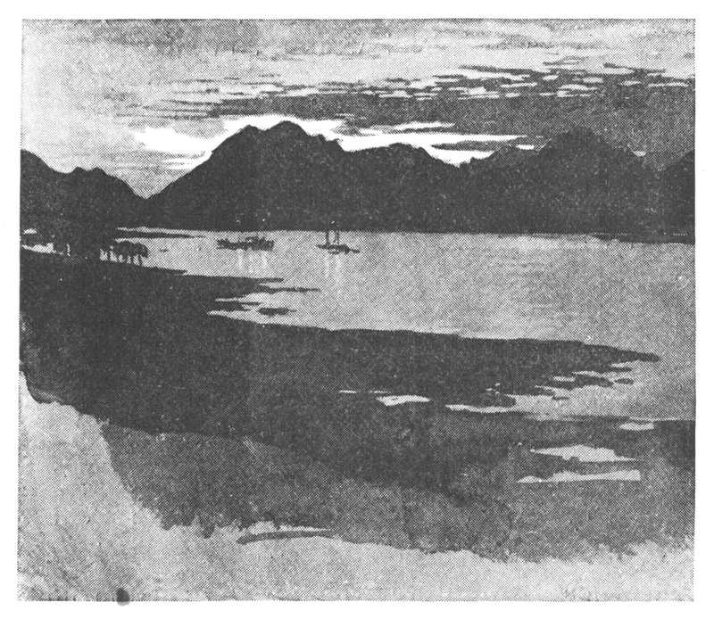 When we walked out after a bad dinner, the eastern hills rose against the pale yellow light of the coming moon. One star sent a shining track across the dark water, over which every now and again the wind marked its passage in long lines of silver ripples. Of all the sweet still evenings of our journey, we shall always remember this as the sweetest and stillest.