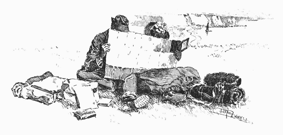 Just then, by chance, there came a drag full of young girls, and when they saw us they laughed, and passed by on the other side. And likewise a dog-cart, and the man driving, when he first saw us, waved his hand, taking us to be friends; but[14] when he was at the place and looked at us, he also passed by on the other side. But two tricyclers, as they journeyed, came where we were; and when they saw us they had compassion on us, and came to us, and gathered up our knapsacks and set them on their machines and brought them to the inn and took care of them. And yet there are many who think cyclers nothing but cads on casters!