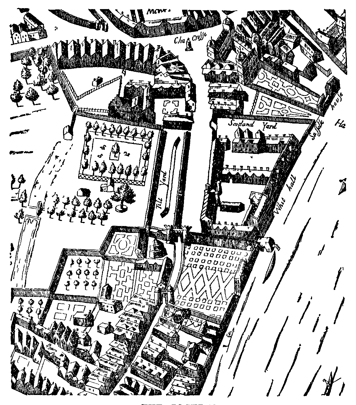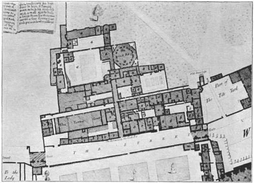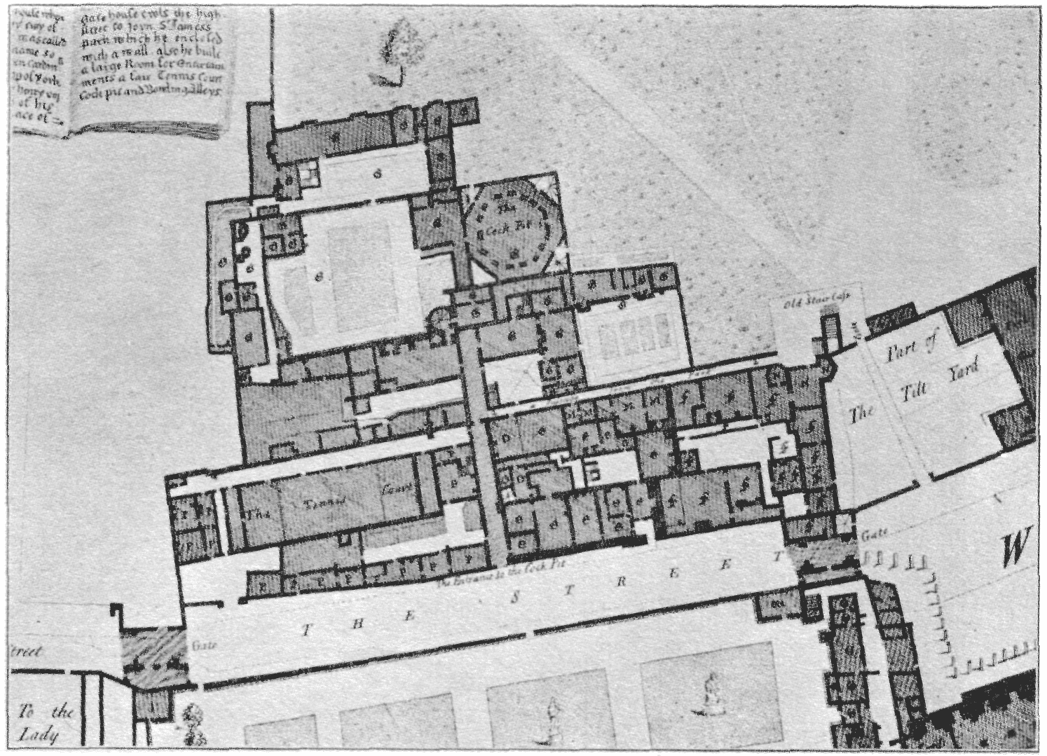 [685] The reasons why the Cockpit at Whitehall has remained so long in obscurity (its history is here attempted for the first time) are obvious. Some scholars have confused it with the public playhouse of the same name, a confusion which persons in the days of Charles avoided by invariably saying "The Cockpit in Drury Lane." Other scholars have confused it with the residential section of Whitehall which bore the same name. During the reign of James several large buildings which had been erected either on the site of the old cockpit of Henry VIII, or around it, were converted into lodgings for members of the royal family or favorites of the King, and were commonly referred to as "the Cockpit." Other scholars have assumed that all plays during the reigns of Elizabeth, James, and Charles were given either in the Banqueting House or in the Great Hall. Finally, still other scholars (e.g., Sir Sidney Lee, in Shakespeare's England, 1916) have confused the Cockpit at Whitehall with the Royal Cockpit in St. James's Park. Exactly when the latter was built I have not been able to discover, but it was probably erected near the close of the seventeenth century. It stood at the end of Dartmouth Street, adjacent to Birdcage Walk, but not in the Park itself. John Strype, in his edition of Stow's Survey (1720), bk. vi, p. 64, says of Dartmouth Street: "And here is a very fine Cockpit, called the King's Cockpit, well resorted unto." A picture of the building is given by Strype on page 62, and a still better picture may be found in J.T. Smith's The Antiquities of Westminster. The Royal Cockpit in Dartmouth Street survived until 1816, when it was torn down. Hogarth, in his famous representation of a cock-fight, shows its interior as circular, and as embellished with the royal coat of arms. Another interesting picture of the interior will be found in Ackermann's The Microcosm of London (1808). It is needless to add that this building had nothing whatever to do with the theatre royal of the days of King Charles.