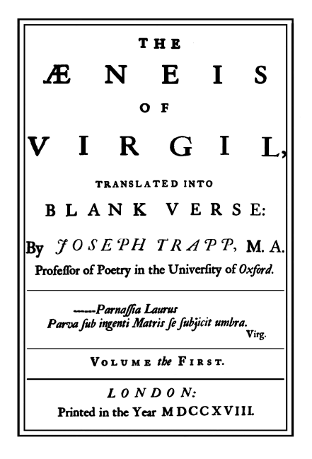 Joseph Trapp's translation of the Aeneid was first published in two volumes dated respectively 1718 and 1720. Its appearance coincided with his vacation of his chair as Professor of Poetry at the University of Oxford, an office which he was the first to hold and to which he had been elected in 1708.[1] The translation may be seen both as a valediction to the University by one whose subsequent career was to be made through the paths of clerical controversy and as a claim for the attention and patronage of the great world. The dedicatee was William, Lord North and Grey, and the list of subscribers is rich with the names of lords temporal and spiritual, including the Lord Primate of Ireland (Thomas Lindsay), who took four sets. Addison, Arbuthnot, Berkeley, Thomas Sheridan, Tickell, Swift, Young, and Thomas Warton (who succeeded Trapp as Professor of Poetry) also subscribed, but not Pope, whose views on Homer, Trapp criticised and misquoted. The University of Oxford was generous in its support (Cambridge was less so). We have, thus, in Trapp's Aeneid a translation of Virgil that was probably read by many of the important figures of the English Augustan cultural milieu. In turn, Trapp, writing with highest academic authority, offers in his Preface an important critical account of Virgil's epic.