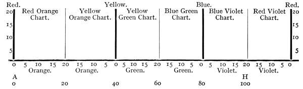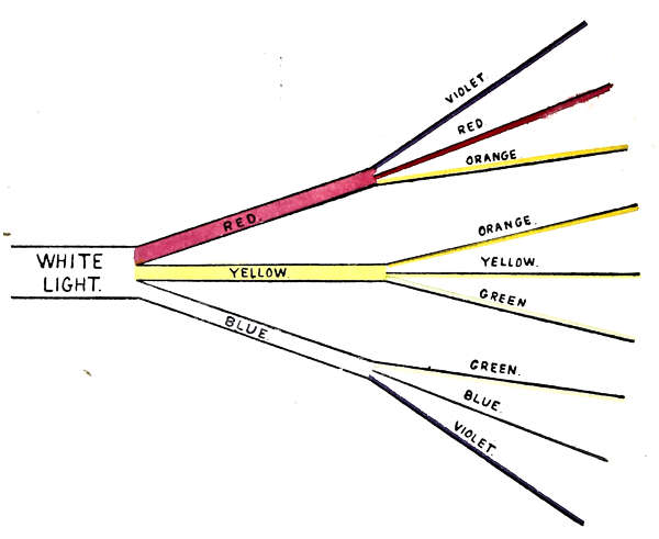 The coloured glasses are called absorbents. The red absorbent transmits violet, red and orange, but the red ray alone is visible as colour, until the other absorbents are superimposed, and the character of the group of rays changed. In the same way yellow transmits orange and green, and blue transmits green and violet, whilst the yellow and blue alone are visible as colour. Orange, green and violet are here called subordinates, which may be developed as follows:—