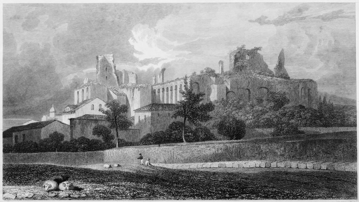 In this part, and along the south-western side of the hills, the remains on the Palatine are very considerable, consisting of lofty piers, and extended arches, but every trace of ornamental architecture has disappeared. Here also we find all that is to be seen of the Circus Maximus, i. e. the general form, favoured by the natural shape of the ground between the Palatine and Aventine hills. I shall not occupy you with any long dissertation on the ancient circus, or on the obscure god Consus, to whom it was dedicated. You know that the general form, in spite of the name, was that of an oblong, with one semicircular end; the other end was not straight, but somewhat curved and inclined, in order as much as possible to put each chariot which started from it, in an equally advantageous situation, and the spina was not placed either precisely in the centre, or exactly parallel to the sides, but in such a manner as to form a road continually narrower as the chariots proceeded in the circuit. A few burrs of rubble-work, and fragments of nearly buried arches, the foundations of the sedili, are all the remains. And now, leaving the baths of Caracalla and the tomb of the Scipios, for the subjects of a future letter, we will cross the Aventine, a hill divided into two summits, on which are the two churches of Santa Prisca, and Santa Saba, and a ruined convent, from which there is a fine view of Rome, and which is itself a very picturesque object. Both these churches contain ancient columns; that of Santa Saba is said in the guide-book, to have twenty-five, two of which are of black porphyry. I found fourteen in the nave, not all alike. Most of the capitals are Ionic, but of different sizes, some pretty well executed, but much degraded; others originally bad; some are merely bossed out, and have never been finished: one is Corinthian, and one is Composite. There are said to be others built up in the wall, but they must be very small. About the altar, are two columns which seem to be chiefly of quartz, but with spots of hornblende, and two of a dark veined marble, but what is meant by black porphyry I do not know. Those of dark marble have Composite capitals, which Uggeri says are of serpentine, but I did not particularly observe them. The front exhibits a gallery of small columns, standing on a high unadorned wall. The contrast is piquant, but perhaps more so where the form is circular, as at the back of Santi Giovanni e Paolo.
