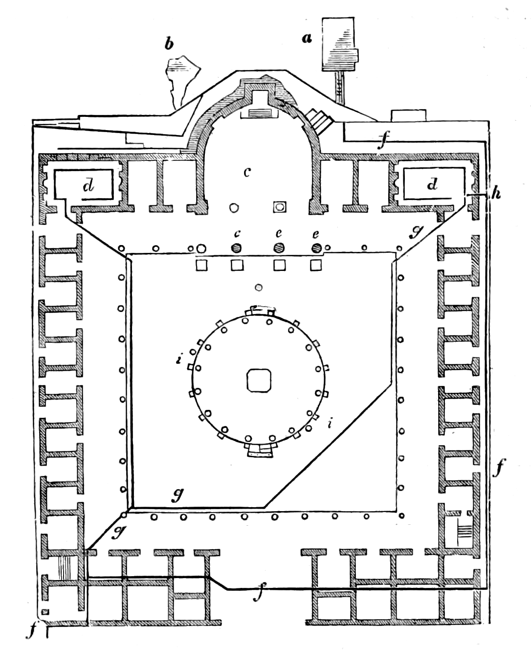 The Church of San Stefano rotondo is a curious edifice, which has been supposed by some, to have been a temple of Faunus, or of Claudius; others say, with every appearance of reason, that it was no temple at all; but when they proceed to state that it was a market, I follow them with less confidence. The body, or most elevated part, consists of a circular wall supported on twenty columns and two piers. The columns are not all of a size, but on an average are about four diameters apart, and about eight and a half high. The architrave, frieze, and cornice united, only form a sort of architrave, of perhaps one diameter and a half; yet it does not look so much oppressed by the great wall above, as the engravings we have of it give us reason to expect. Faulty and defective as it is, it perhaps might serve as a lesson, that a wall rising immediately on 7the architrave of a circular colonnade, would not have an unpleasing effect; and that with this simple arrangement, a height equal to the width, would be quite sufficient. At present the building is singularly spoilt, by a wall running across the middle of it, apparently to support the roof; but it is in fact as useless as it is ugly. This wall is open below, with three arches resting on the side walls, and on two Corinthian columns. The capitals of the circular colonnade are Ionic, various, but all bad, and the bases of all forms. The two middle columns are very fine, with good bases, and Corinthian capitals. The cross wall is conjectured not to have been a part of the original building, but nobody knows when it was added. A double aisle surrounds this central part, divided by a range of columns, which are smaller than those of the first circle, and not disposed so as to have any correspondence with them. The outer circuit is a plain wall, but part of the second aisle is divided into chapels. It is completely a building made up with the spoils of others, and the few restorations are miserably executed; circumstances which favour the idea that it was erected in the time of Constantine. It is too bad for us to believe it of an earlier date, and after him, few if any public buildings were executed in Rome, except churches. The piety or superstition of the times seems to have continued the erection of these during the darkest and most unhappy periods of falling Italy; yet there seems to be a deficiency, even of religious structures, from the beginning of the fourth, till towards the end of the seventh century, when a new character and new relations began to develop themselves.