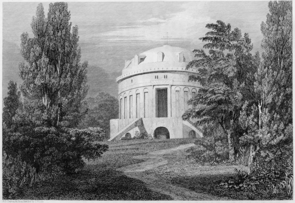 The first room which we now enter is a circular vestibule, where the supine arches of the four openings are particularly offensive, because they are very large in proportion to the building; some scheme arches in the great hall are also disagreeable, but the hall itself is a noble room, and produces the full effect of its large dimensions. There is a pleasure arising from these large and simple parts, which it is impossible to describe, and which I long in vain to communicate to you. The old work is generally distinguishable from the modern additions; indeed, no pains have been taken to copy exactly the antique. Of the principal columns, four have Corinthian, and four Composite capitals; and this seems to have been originally the case, though the columns themselves are now, some of granite, and some of stuccoed brickwork. The groined vaulting is whitewashed, and has no ornament, except the brass knobs to which the lamps were anciently suspended.