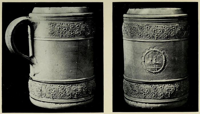Other makers of this school were Thomas and William Sans, Ralph Simson and William Taylor. They made two-handled drinking mugs called “tygs” with similar decoration; and small model cradles made in clay and slip—presents for young married couples, according to their local custom. Puzzle Jugs were another “freak” production, speaking the humour of the time. The jug was so contrived with multiple spouts and hidden passages[13] as to spill however one tried to drink from it. A sample of these puzzle jugs in stoneware bears the inscription “John Wedgwood 1691.”[8] This man was the eldest son of the Thomas Wedgwood previously mentioned, and did not pot himself. I think this jug was made for him by his nephew, Richard Wedgwood, to whom he both leased the Overhouse Works and married his daughter and heiress. Several pieces are marked with the name “Joseph Glass,” who is known to have been a potter in Hanley in 1710-15.