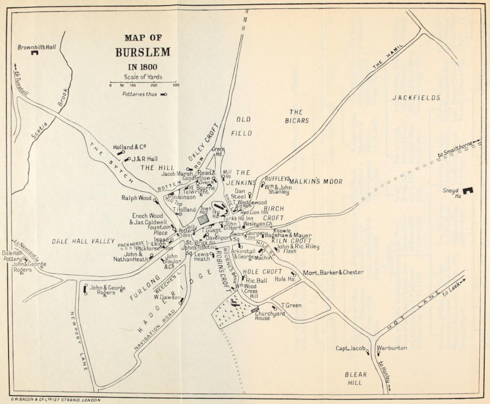 The area where pots were made in North Staffordshire has always been peculiarly local and circumscribed. It extends, and extended, in a line from Golden Hill to Meir Lane End. Occasionally, at times, we hear of Pot-works at Red—or Ridge—Street, at Bagnal or at Bucknall, outside this narrow area. They only receded finally from Chesterton during the last century. But, generally speaking, Staffordshire potters have persisted always in making pots just where their fathers made them before, in the hilly land between the Foulhay Brook and the sources of the Trent.