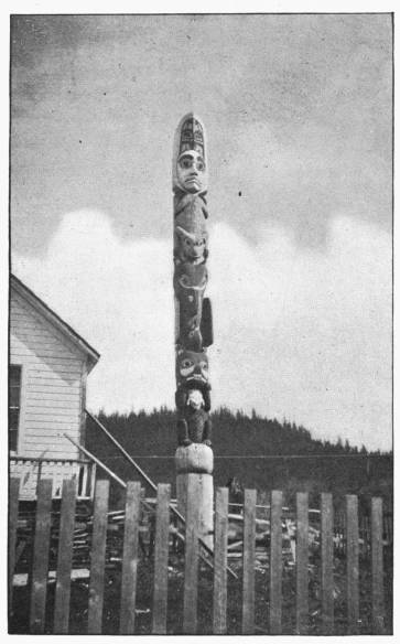 There are along this route all the benefits of a sea trip—the air, the rest—with none of its disadvantages. So steep are the shores that the steamer may often lie alongside of them when she stops and run her gang-plank out on the rocks. These stops show the traveller the little human life there is in this vast and desolate country. There are villages of the native tribes, with dwellings built in imitation of the common American fashion, in front of which rise great totem poles, carved and painted, representing grinning and grotesque animal-like, or human-like, or dragon-like figures, one piled on top of the other up to the very top of the column. A sort of ancestral tree, these are said to be,—only to be understood with a knowledge of the sign symbolism of these people—telling of their tribe and lineage, of their great-grandfather the bear, and their great-grandmother the wolf or such strange things.