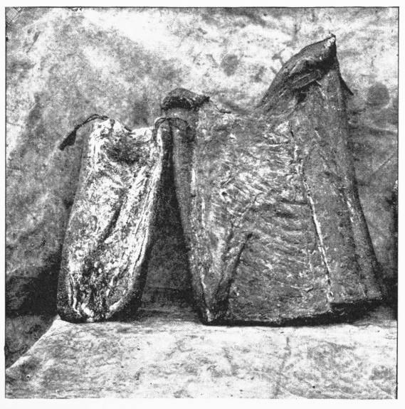 The next thing was to cut up and divide the carcass, and this was done thoroughly, everybody in the village coming in for a share. Nothing was wasted. Even the blood was carefully saved and divided, and the sinews were given to the women, who would dry and make them into threads for sewing. Soon all the fires in the village were burning, and the smell of boiling whale-flesh came from many pots, into which[270] the women peered expectantly. One old lady whom I noticed doing this showed in her dress some of the effects of civilization, which is a rare thing with the Eskimo, as they dress by preference in their squirrel or muskrat-skin parkas; her flowing garment was made of flour-sacks sewn together, and one might read the legend, inscribed many times and standing in many attitudes, that the wearer (presumably) was Anchor Brand.