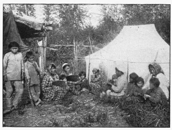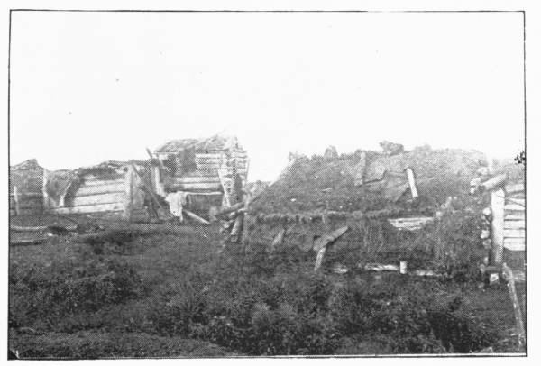 After supper we made the tour of the village, crawling into the little cabins of the natives,[251] where the women sat cross-legged in groups, occupied in their sewing. They were making gloves of moose-skin trimmed with beaver, caps of the ground squirrel or marmot fur, and high boots of the hair seal with bottoms of walrus hide. Most of them used steel needles, though many still kept to those of pierced bone, which seemed in skillful hands to serve the purpose quite as well. Our curiosity was soon satisfied, for each dwelling was much like every other; so after we had made bargains for some of the articles, we went back to our cabin and turned in. The joy of having a roof over our heads as a protection against the rain which was now pelting down was so great that I lay awake some little time staring gloatingly up at the logs.