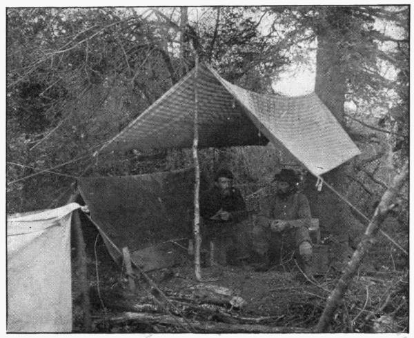 For our personal use we had a single small tent, A-shaped, but with half of one of the large slanting sides cut out, so that it could be elevated like a curtain, and, being secured at the corners by poles or tied by ropes to trees, made an additional shelter, while it opened up the interior of the tent to the fresh air or the warmth of the camp-fire outside. Blankets for sleeping, and rubber blankets to lay next to the ground to keep out the wet; the best mosquito-netting or "bobinet" of hexagonal mesh, and stout gauntleted cavalry gloves, as protection against the mosquitoes. For personal attire, anything. Dress on the frontier, above all in Alaska, is always varied, picturesque, and unconventional. Flannel or woollen shirts, of course, are universal; and for foot gear the heavy laced boot is the best.