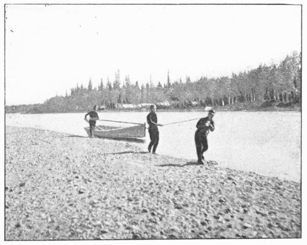 From here we kept on travelling with the current down the Yukon, helping our speed by continuous rowing. There being three of us, "tricks" of one hour were arranged, so each man steered for an hour, rowed an hour, and then sat in the stern for an hour, regarding the landscape and making notes. It grew so chilly that often the time for resting was hardest to endure, for the skin would cool and the teeth would chatter even with all the clothes we could get on, and we would be glad to get a little vigorous exercise again. Storms were frequent, and we often had the pleasure of sitting in the driving rain all day long. We covered over our outfit as well as we could and even rigged up a sort of awning of sail-cloth on a frame-work of boughs, which kept the rain off the steersman, while the man who was resting crawled under a tarpaulin, and the oarsman rowed and got wet; so that under these conditions the position of steersman was most coveted. The wind blew with such violence that sometimes we took water over the bow and stern of our boat, and the[239] steerman had to exert skill to keep from swamping. When the weather was clear, however, it was cool, and we enjoyed life more at such times than we had before done.