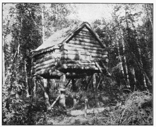 Starting out again, we found, soon after leaving our sheltered nook, that the wind was still blowing, and in stretches of the river where the wind was ahead we could move only very slowly, while on other curves we went at a high rate of speed. So we moved along by jerks till about noon, when we were brought to a standstill by an increase in the wind, and after an effort to proceed further, which resulted in our being blown back a little up the river, we landed, waited an hour and lunched; after this, the wind having gone down somewhat, we proceeded.[249] We passed several native villages, both winter and summer camps, the former with their clumsily built log houses and attendant log caches, the latter with their white tents and lines of fish drying on frames in front. The inhabitants shouted out vociferous greetings to us as we passed, which we did not understand; but we responded quite as cordially in our own tongue. At about five o'clock we reached the native village of Nulato, one of the largest on the river, with a population of several hundred, and a small trading post, at that time kept by a half-breed trader.
