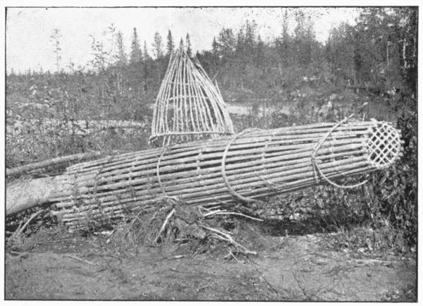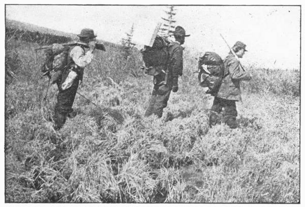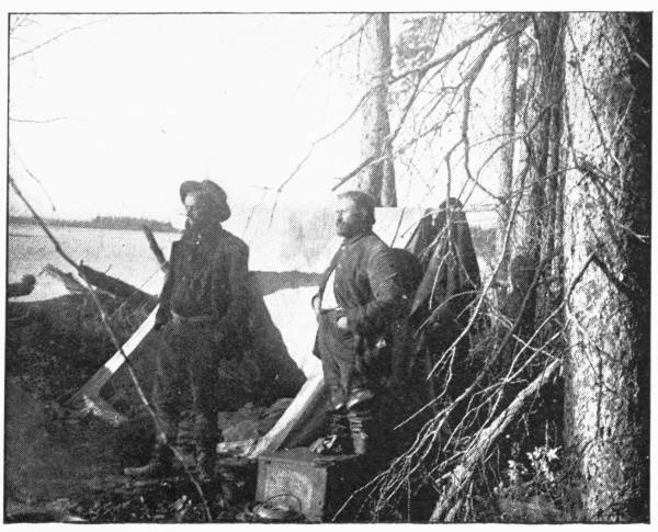 As usual, we were led by the prospective terrors of cold water in the lakes and streams to invest in rubber boots reaching to the hip, which, however, did not prove of such use as anticipated. We had brought with us canvas bags[24] designed for packing, or carrying loads on the back, of a model long used in the Lake Superior woods. They were provided with suitable straps for the shoulders, and a broad one for the top of the head, so that the toiler, bending over, might support a large part of the load by the aid of his rigid neck. These we utilized also as receptacles for our clothes and other personal articles.