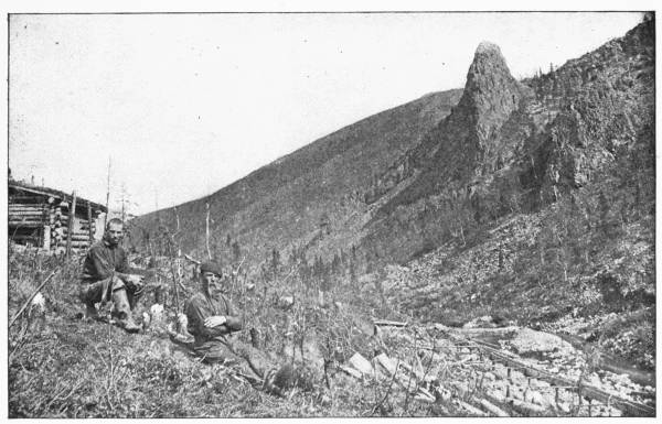 According to directions, I left the trail, which indeed ran no further, and followed the bank of[224] the main stream, working my way through the brush, till I came to a little brook, then went up along this nearly to where it emerged from a rocky gorge in the hills. At this point I came upon a grassy nook under the birches, where a fire was smouldering; and under a tree a man's heavy blankets were spread on a bed of green boughs, as if he had just stepped out. A couple of kettles were standing near the fire, and a coat was lying on the ground, while an axe was sticking in the tree above the blankets. There was no tent or any superfluities whatever, and it was evident that this camping outfit was one of those which a man may take on his back and wander over hill and dale with. Not hearing or seeing any sign of life, I sat down and waited, but no one appearing after half an hour, I began following a man's trail from the camp up the gorge, tracing him by the bent grass and broken twigs. After having gone a short distance, I heard the thumping of a pick on a rocky wall in front and above me, and gave a hail. The prospector came down very slowly, his manner not being so much that of a man who was sorry to see one—on the contrary, he was pleasant and cordial—as that[225] of one who is reluctantly dragged away from a favorite employment. We went back to his camp under the birches and as it was now noon he invited me to dinner with him.