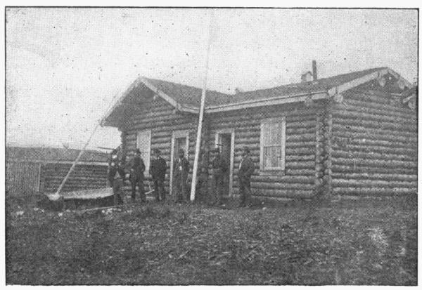 The same day we left the Yukon for good, emerging from the northern or Ap-hoon mouth, (for the Yukon forms a delta which spreads out many miles and includes many channels) out on the open sea. We were struck with the color of the clear green water, after so long viewing the muddy brown Yukon or the clear black of some of its tributaries. Before us the country was barren, untimbered, and black, with volcanic cones rising here and there. As we advanced, low islands rose out of the sea around these cones,—fields of lava, covered with swamps and ponds,—while we left behind us the dead level untimbered tundra of the Yukon delta. We anchored under the lee of an island that night, and as usual we were roused from our sleeping places before daylight the next morning by the[263] cook. The sun rose gloriously from behind the low black volcanic hills and just as we were getting around to breakfast at the fourth table we steamed into St. Michael's.