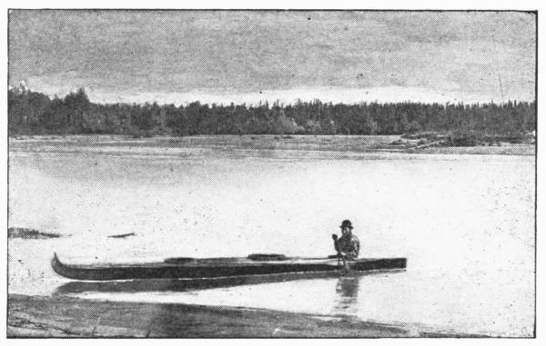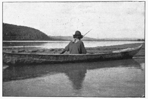 The next day we broke camp, and floating down the river, soon entered the main range of the Rampart Mountains. They were not high, but picturesque, and the lower parts and the valleys were gay with green and gold. It was a perfect day, cool and clear. We stopped for the night below the so-called rapids, which at this time of low water were hardly noticeable. An Indian came to our camp from his village across the river, and we traded a can of condensed milk with him for a silver salmon. I got into his little narrow birch canoe, and managed to paddle it with the feather-like paddle, thanks to my experience in rowing a racing-shell; but it required infinite care in balancing. I could not help admiring the ease with which the Indian managed the delicate boat when he left us for home again, and wondering how these people catch salmon out of canoes like these.