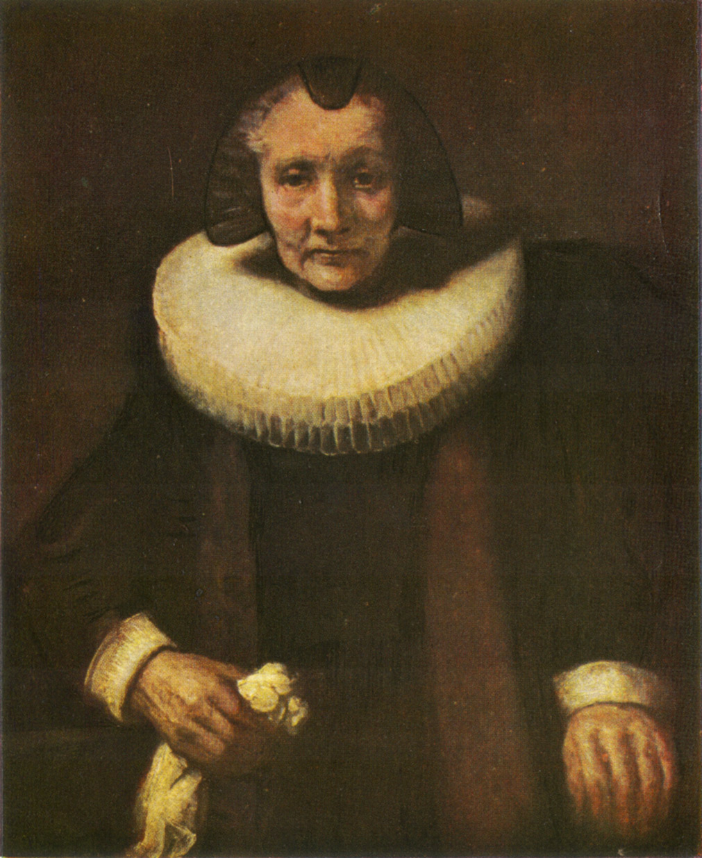 The background is such as Rembrandt only, with his understanding of lines, could have devised. The wall and the panelling shut in the composition in such a way that one cannot possibly imagine it ever having been otherwise. And even this skilful touch is made subordinate to the warm red colour of the tablecloth, which lends the picture an additional depth.