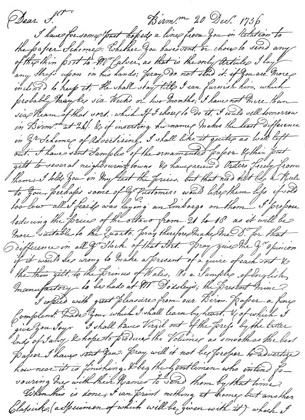The Virgil was then advertised as follows: “John Baskerville proposes, by the advice and assistance of several learned men, to print from the Cambridge Edition, corrected with all possible care, an elegant edition of Virgil. The work will be printed in quarto, on a very fine writing Royal paper, and with the above letter. The price of the Volume in sheets will be one guinea, no part of which will be required till the Book is delivered. It will be put to press as soon as the number of subscribers shall amount to five hundred, whose names will be prefixt to the work.”