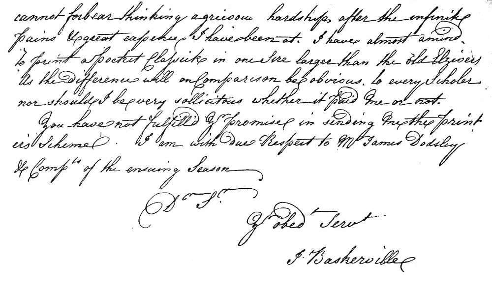 In the meantime Baskerville was pushing forward the printing of a Prayer Book, “as perfect as I can make it.” He said that he would make a size “calculated for people who begin to want spectacles, but are ashamed to use them in Church.” Perhaps this was the reason for the old Oxfordshire Squire refusing to use a Prayer Book which was not a Baskerville.