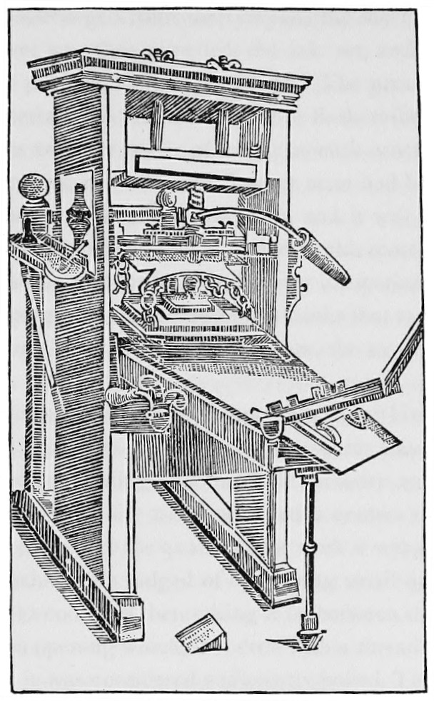 He said in a letter to France, that the presses were exactly of the same construction as other people’s, but that he had made them better, especially in the stone and the platen, all of which could be done with a person who gave attention to it; and that in printing he used but one double of finest flannel, other people used two or three double of thick swanskin; and for a description and drawing of his presses he referred to Palmer’s “History of Printing,” and “The History and Art of Printing,” by Luckombe, in which he said there was a print of every part of the press.