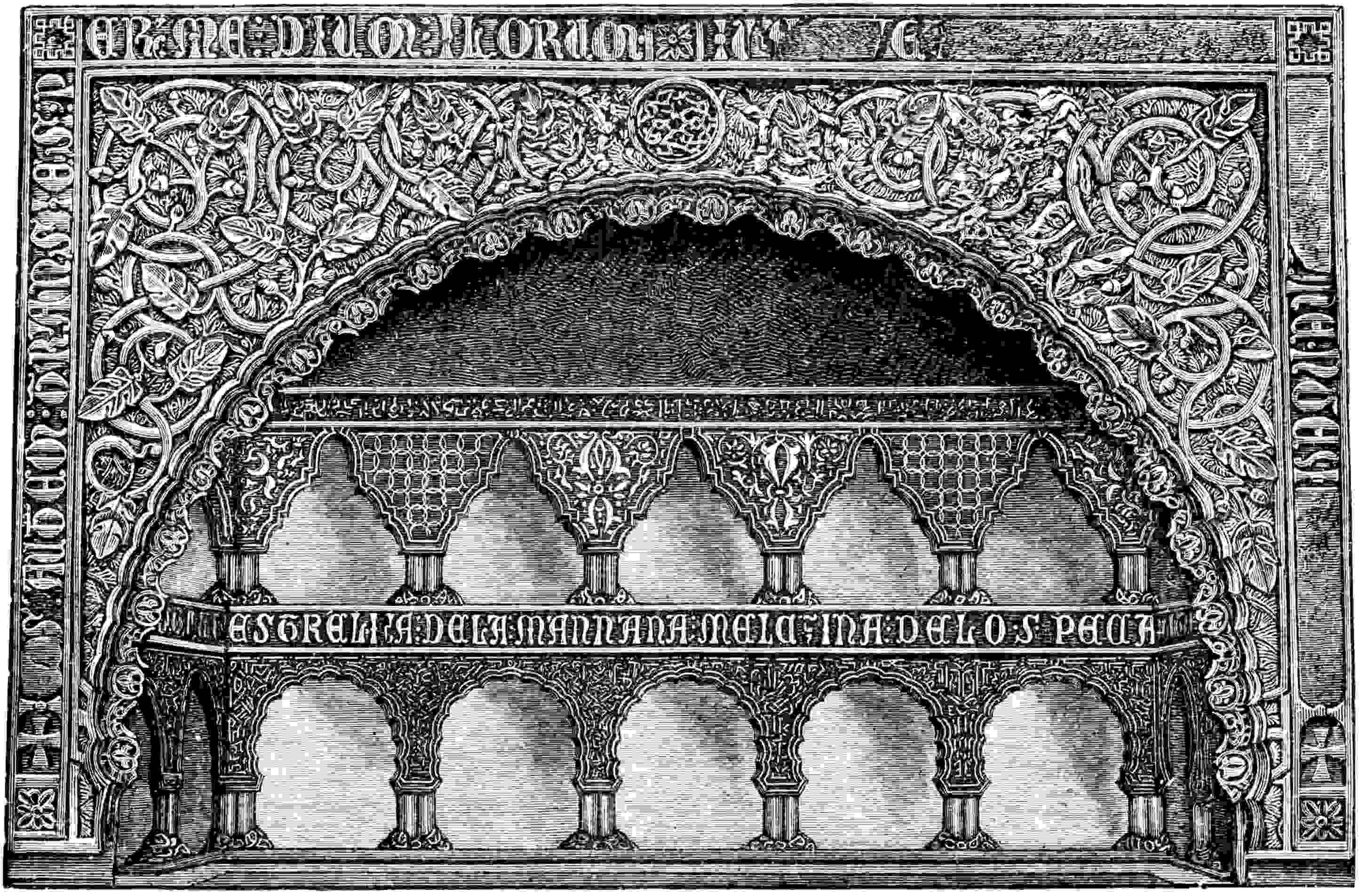 The manufacture of tapestry or carpets was introduced into Spain by the Arabs. The earliest historical information which I have been able to find relating to this industry occurs in Edrisi, an oriental author of the beginning of the 12th century, ["Descrip. de l'Afr. et de l'Esp., trad. de Dozy el Goeje,"] when speaking of Chinchilla in the province of Alicante, he says: "On y fabrique des tapis de laine qu'on ne saurait imiter ailleurs, circonstance qui dépend de la qualité de l'air et des eaux." In mentioning Cuenca, he says: "Les tapis de laine qu'on y fait sont d'excellente qualité," p. 237. Although we find very few descriptive details of this industry, it is undoubtedly the fact that in a wide zone which comprehends from the kingdom of Valencia until that of Granada, carpets have been constantly made; for even in the present day this industry is alive in a number of towns, where not only the old technical proceedings are continued, but also much of the primitive character of the designs and colours. In confirmation of this, I find frequent mention in books and MSS. of the 16th century of carpets of Letur, made in the kingdom of Murcia, Alcaraz, and Baeza.