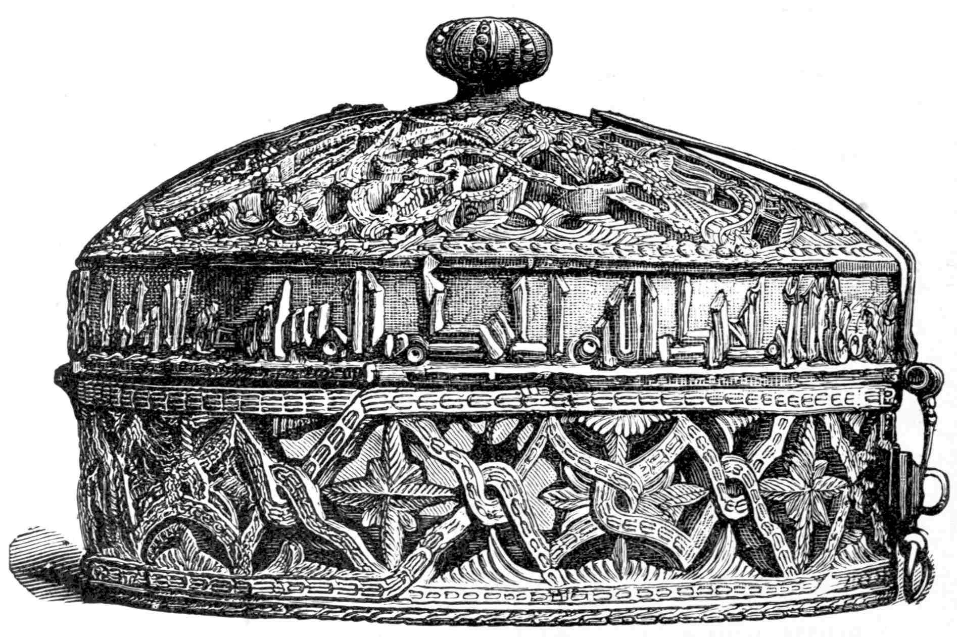 The importance of this goldsmith's work has led these authors to discuss several archaeological and artistic points which deserve attention. I will also give my opinions on this subject, which in some respects differ from those hitherto advanced. In the Middle Ages the name of crown was equally applied to those worn on the head, to the votive crowns hung before altars, and to the pendent lamps which were also of this circular form. The "Etimologies" of San Isidoro help us, unfortunately, but little on this subject; but Du Cange, in his "Glossarium Mediæ et infimæ Latinitatis" gives us sufficient details to understand the differences between them. I refer the student to two works on this subject, which treat especially of crowns of light, which none of the authors who have written on Guarrazar have consulted: "Tratado de la Sagrada Luminaria," by Gonzalez Villar, Madrid, 1798. "De Lucernis Pensilibus," by Fanceulli, Maceratae, 1802.