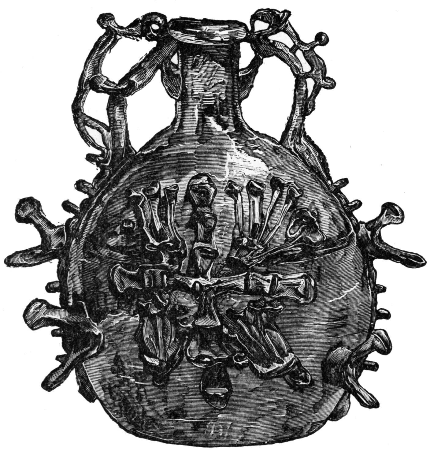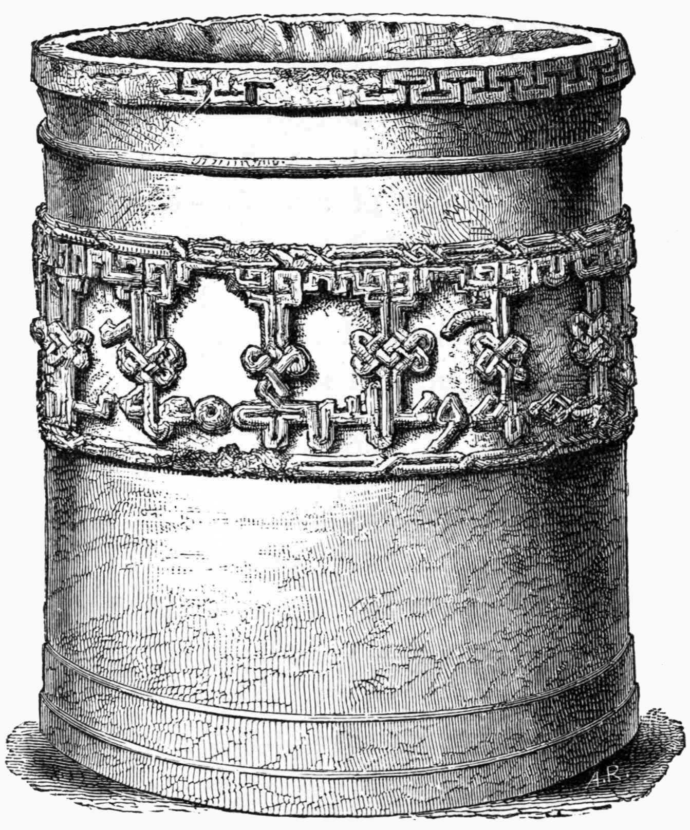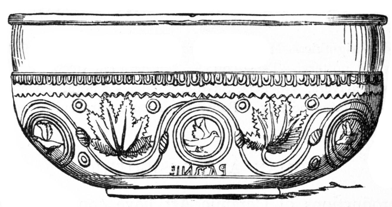 The information and remains which have reached us illustrating silver and gold work of the Roman domination are more important; we find, however, in this and similar artistic industries that, as a general rule, the Romans imposed their style and system on the inhabitants of the countries which they conquered, and it is not easy to point out any one example which can be given as an exception to this general rule. It is, undoubtedly, a fact that objects of all kinds in gold and silver were used in Spain to a very great extent—for, notwithstanding the destruction of ages, we still possess inscriptions which allude to silver statues, and a large number of objects in the precious metals exist in museums and private collections. See "Inscrip. Hisp. lat.," by Dr. Emile Hübner, Berlin, 1869. Of these it will be sufficient to mention one of the most important. It is known in the province of Santander by the name of the dish of Otañez; and belongs to a gentleman who lives in that locality. It was found at Otañez at the end of the last century, buried in a stone quarry. This dish is made of silver, it weighs thirty-three ounces, and is covered with an ornamentation of figures in relief, some of which are gilt, representing an allegorical subject of the source of medicinal waters. In the upper part is a nymph who pours water from an urn over rocks; a youth collects it in a vessel; another gives a cup of it to a sick man; another fills with it a barrel which is placed in a four-wheeled car to which are yoked two mules. On each side of the fountain are altars on which sacrifices and libations are offered. Round it is the inscription: SALVS. VMERITANA, and at the back is engraved, in confused characters, the words: L. P. CORNELIANI. PIII....