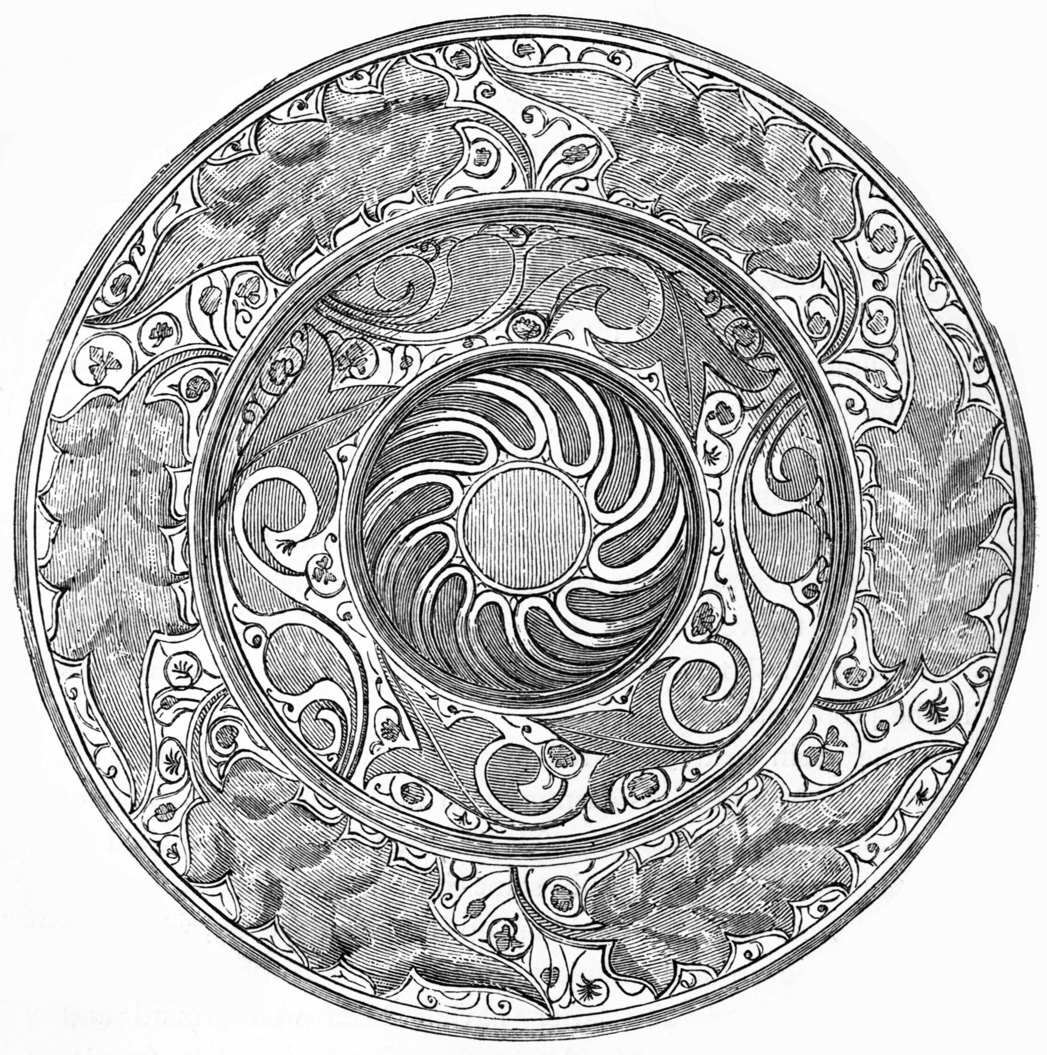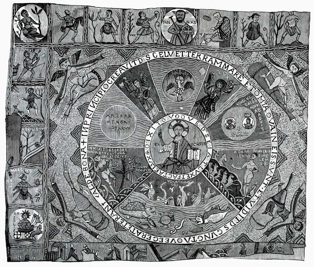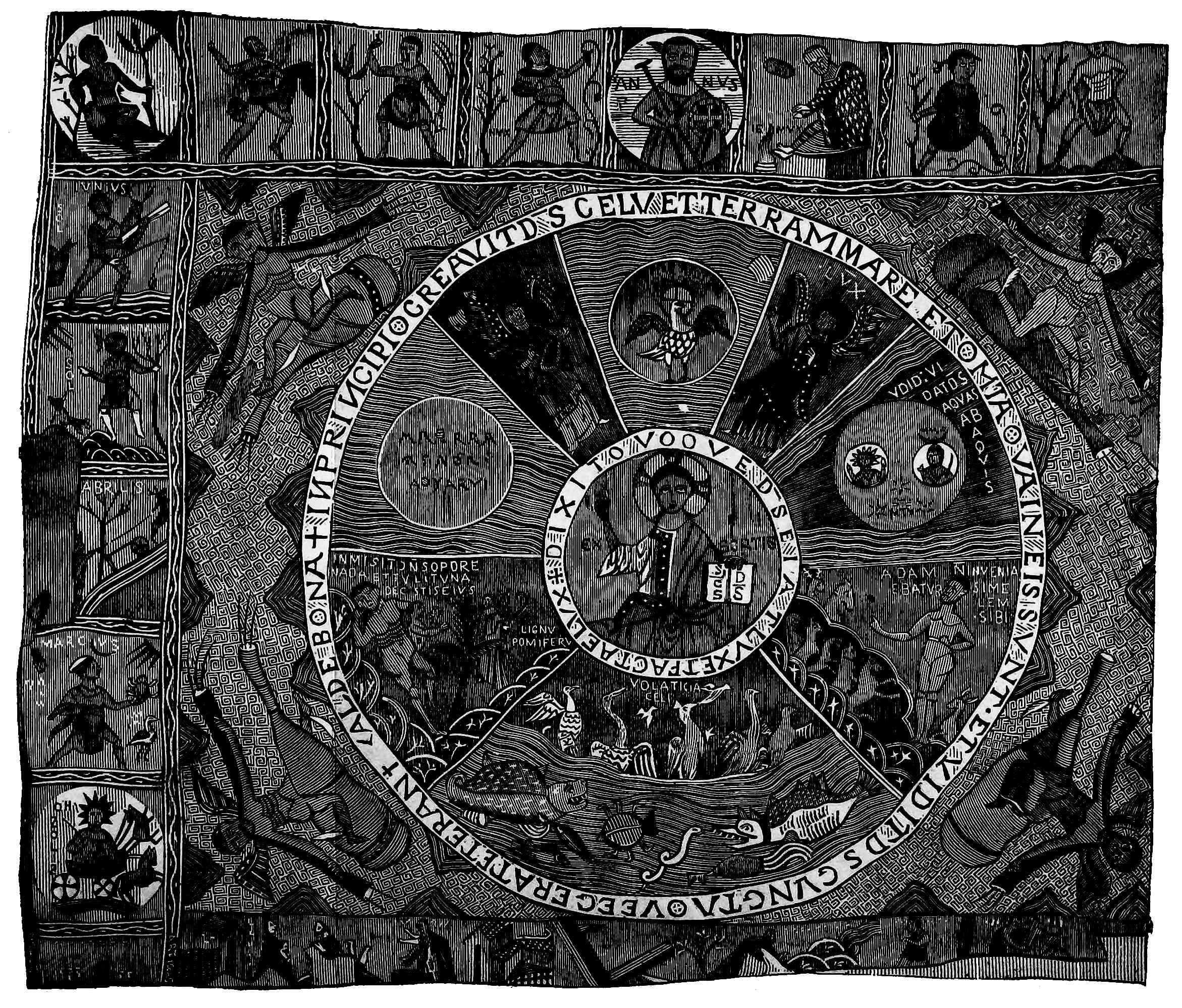 The space between the two circles is divided by radiating lines into eight portions, in which are represented the Mystic Dove, the angels of light and darkness: the division of land from water, the creation of sun, moon, and stars, of birds, fishes, and beasts, and of Adam and Eve. In the angles outside the larger circle are the four winds, and the whole is surrounded by a border, imperfect in parts, containing representations of the months, and apparently of certain scriptural incidents, too much defaced to be clearly made out. The accompanying engraving, though imperfect and inaccurate in some of its details, gives a general idea of this work.