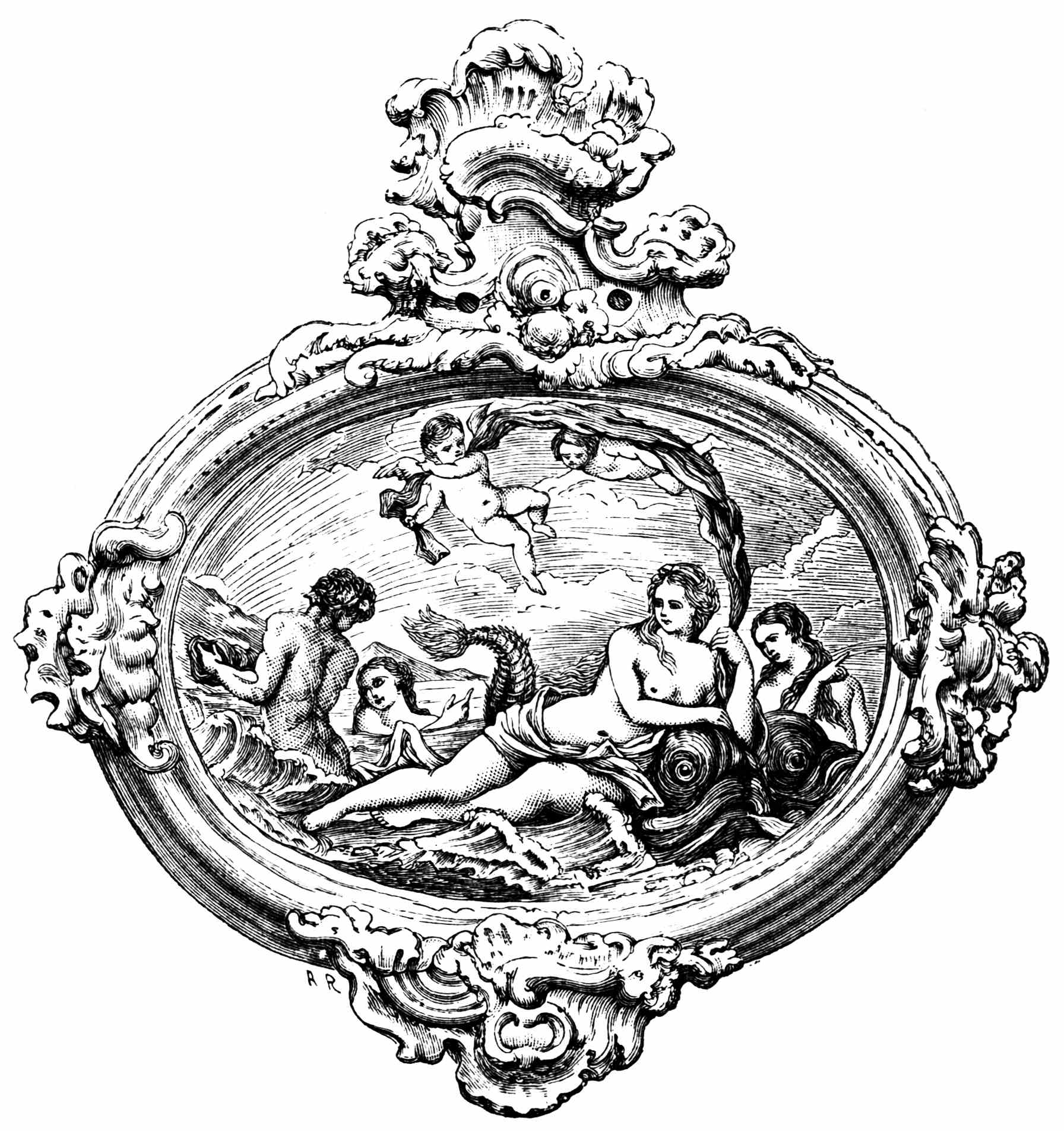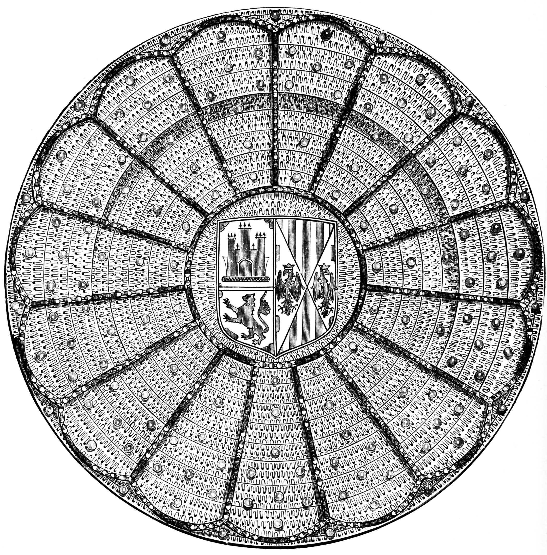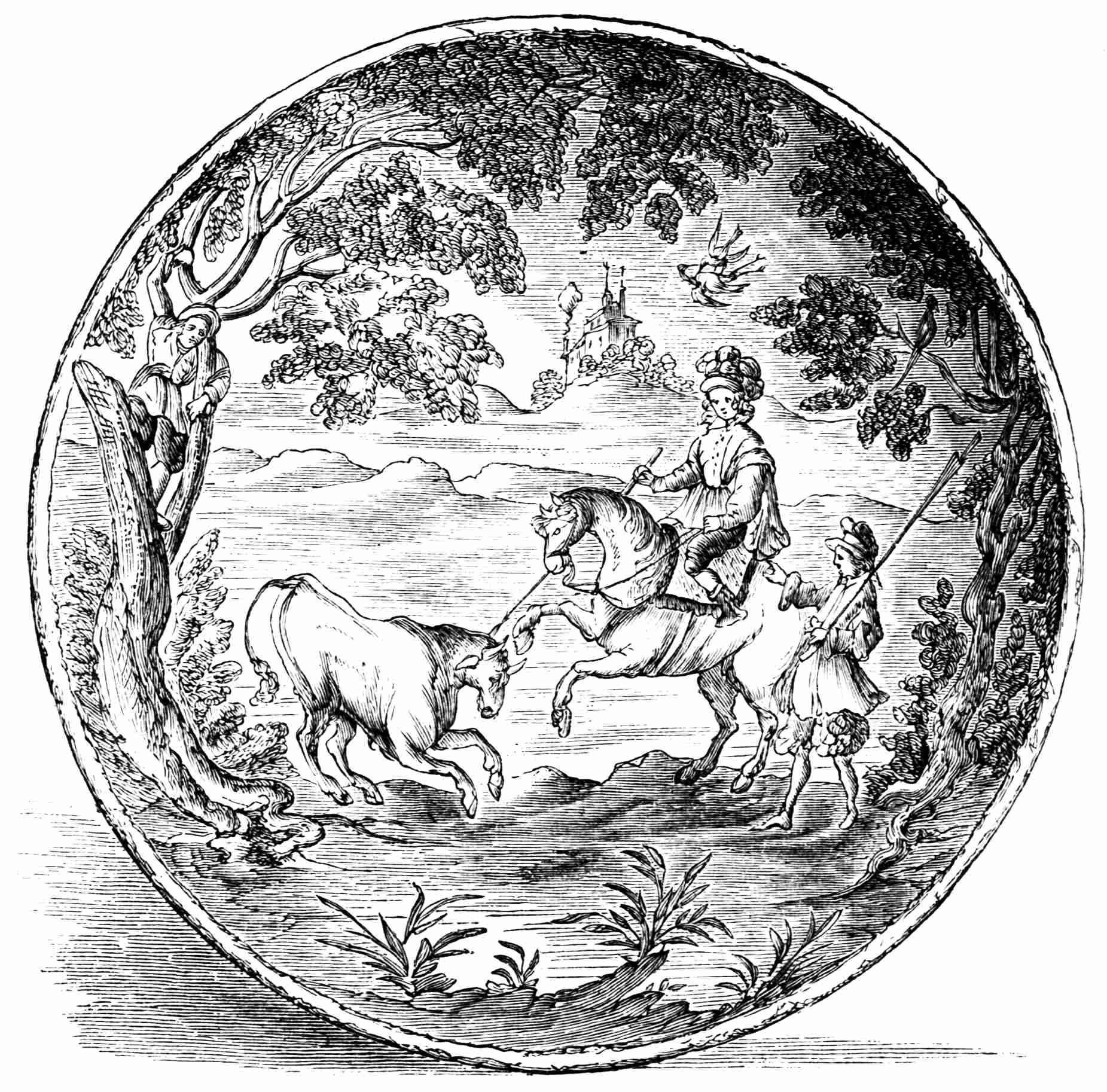 The space between the two circles is divided by radiating lines into eight portions, in which are represented the Mystic Dove, the angels of light and darkness: the division of land from water, the creation of sun, moon, and stars, of birds, fishes, and beasts, and of Adam and Eve. In the angles outside the larger circle are the four winds, and the whole is surrounded by a border, imperfect in parts, containing representations of the months, and apparently of certain scriptural incidents, too much defaced to be clearly made out. The accompanying engraving, though imperfect and inaccurate in some of its details, gives a general idea of this work.