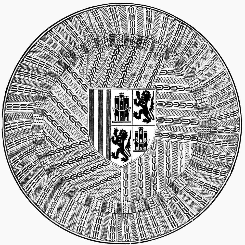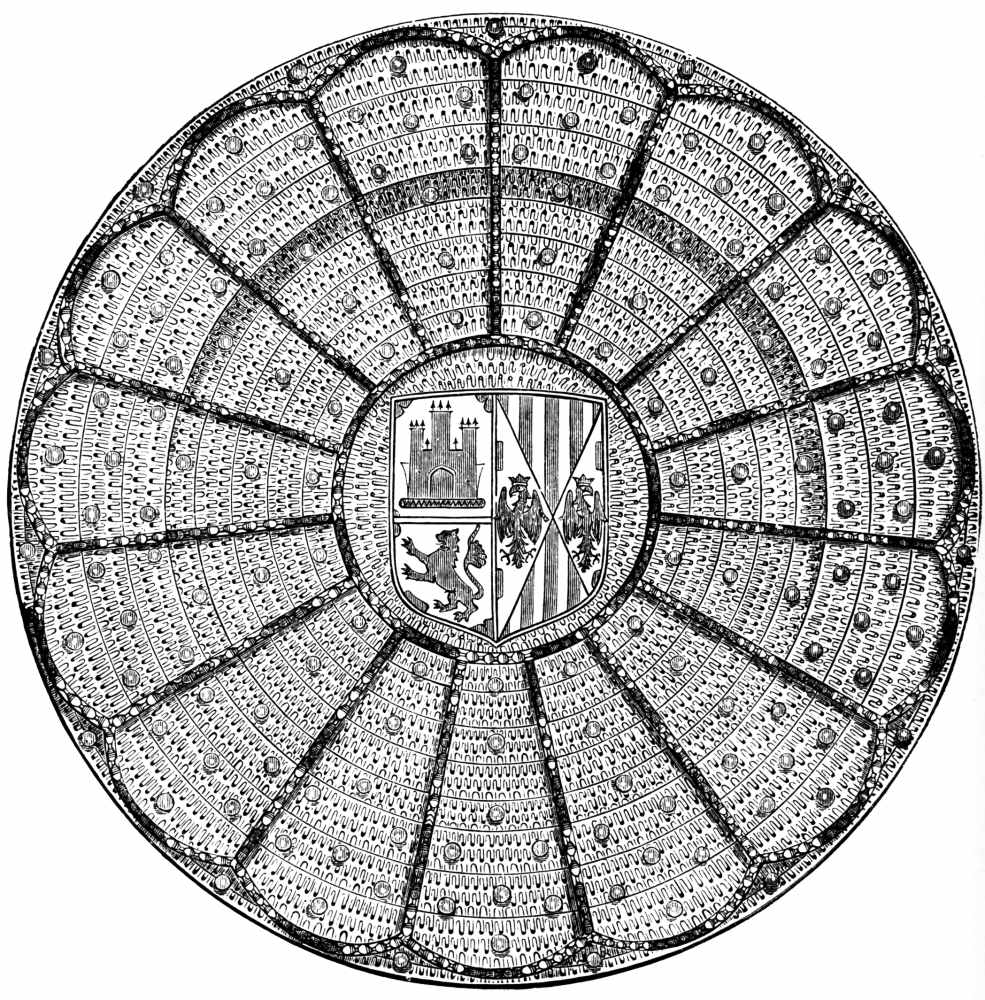 About forty sets of splendid vestments exist at this cathedral which are embroidered with the most exquisite taste, belonging to the 15th and 16th centuries. Each set generally includes a chasuble, dalmatic, cope, altar frontal, covers for the gospel stands, and other smaller pieces. The embroideries on the orphreys, which are formed of figures of saints, are as perfect as the miniatures on illuminated MS. The manga, or case which hangs round the processional cross given by Cardinal Ximenez, is one of the most splendid specimens of this collection. As a fine specimen of embroidery on a large scale must be mentioned the dosel or canopy called the tent of Ferdinand and Isabel, also at the cathedral of Toledo, which is interesting as being the same which was used in the reception of the English envoys Thomas Salvaige and Richard Nanfan who were sent in 1488 to Spain to arrange the marriage of Prince Henry with the Infanta Dna. Catalina. The ambassadors describe it in the following manner: "After the tilting was over, the kings returned to the palace, and took the ambassadors with them, and entered a large room: and there they sat under a rich cloth of state of rich crimson velvet, richly embroidered with the arms of Castile and Aragon, and covered with the device of the king, which is a ... (blank in original), and his motto, written at length, which is 'Tanto Monta.'" ("Memorials of King Henry the Seventh," Gairdner, Lon. 1858, p. 348.)