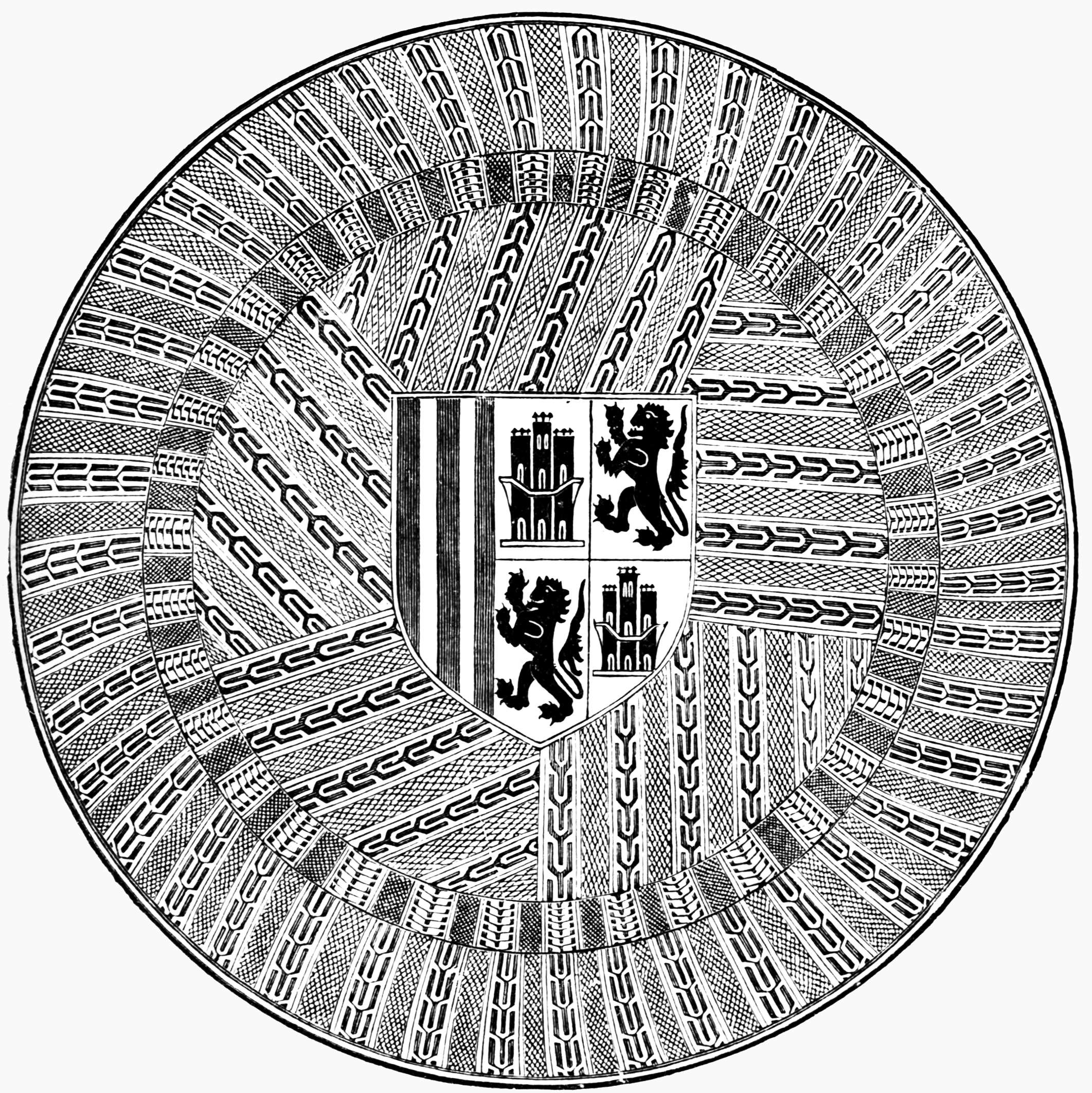 From the period when these embroideries were made until the middle of the 18th century, Spanish embroideries lost much of their artistic character, although the work itself continued equally excellent. During the whole of the 17th century, a style of embroidery became very general in Spain, which appears to have been copied from eastern importations by the Portuguese or the Spanish possessions in America. The specimens most generally met with in Spain are chiefly bed covers, the ground of which is either linen or satin, embroidered in chain stitch, with figures and exotic birds and animals. Their effect is very rich, and the ornamentation is arranged generally in circles. Specimens exist in England of this kind of work; for example, a quilt, said to have been made for an Archbishop of Toledo, lent by Lady Cornelia Guest to the Special Exhibition of Embroidery held at South Kensington in 1873.