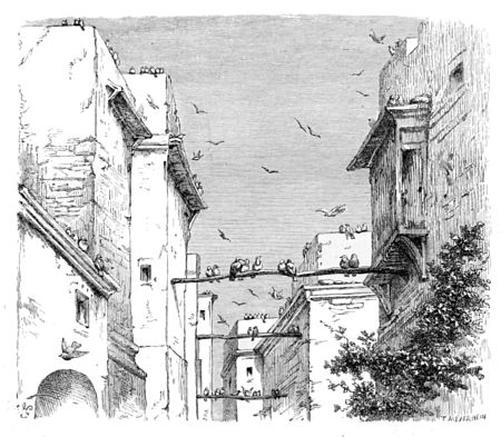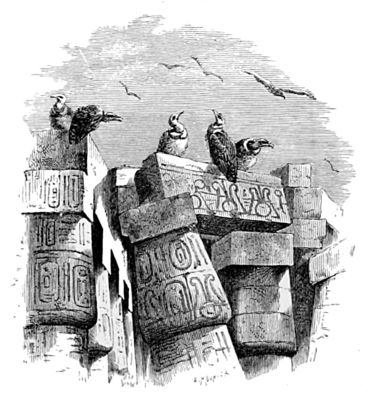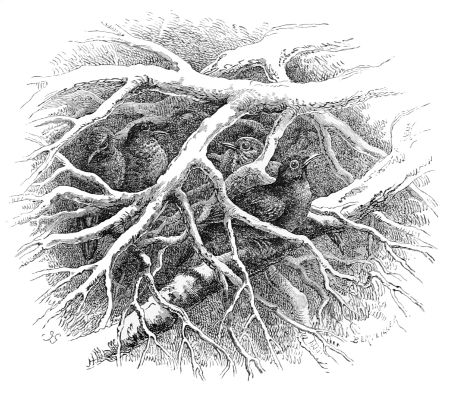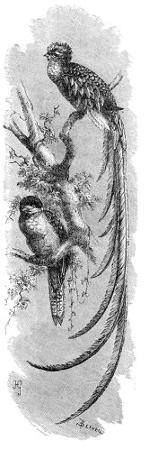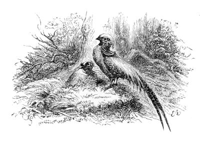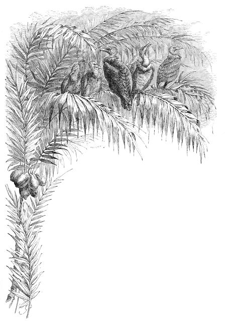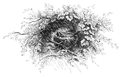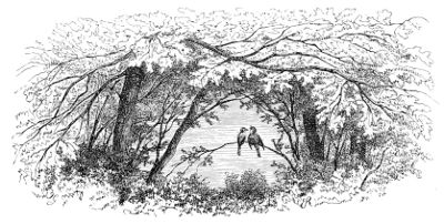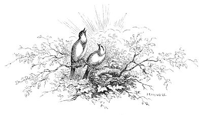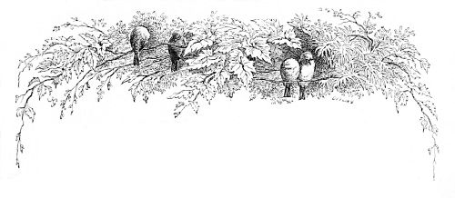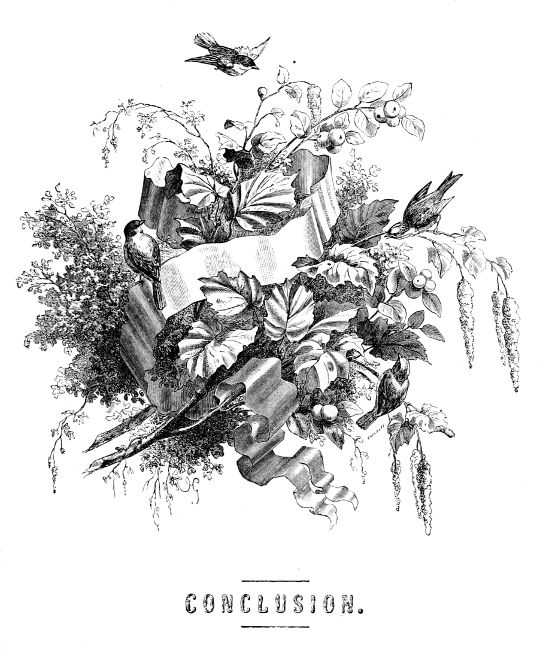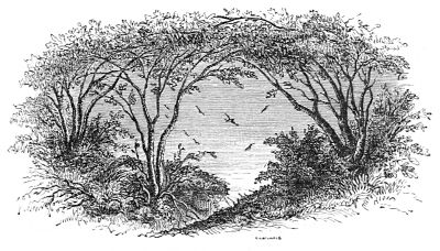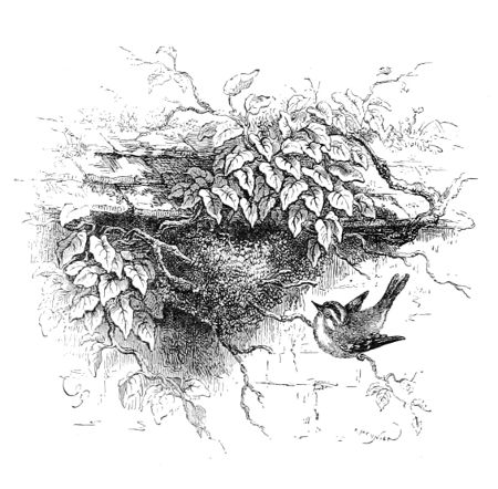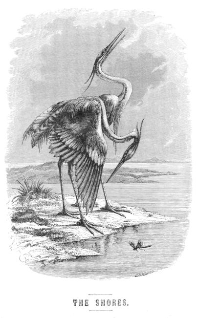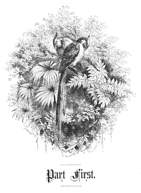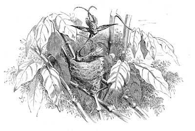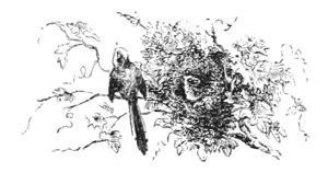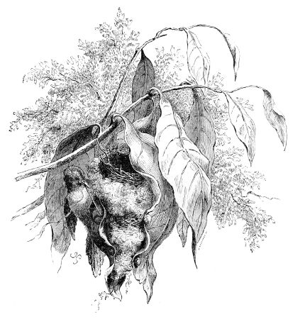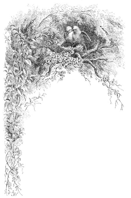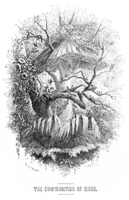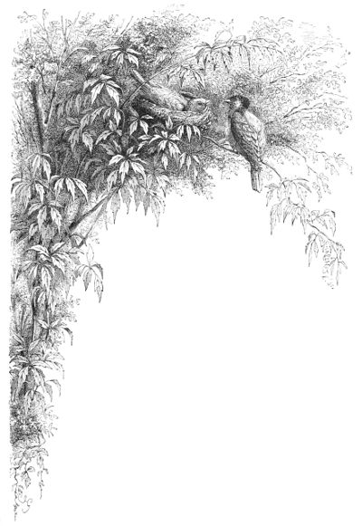 Page 247. Nests and Hatching.—In the vast extent of the islands linking India to Australia, a species of bird of the family Gallinaceæ dispenses with the labour of hatching her eggs. Raising an enormous hillock of grasses whose fermentation will produce a degree of heat favourable to the process, the parents, as soon as this task is completed, trust to Nature for the reproduction of their kind. Mr. Gould, who furnishes these curious details, speaks also of some curious nests constructed by another species of bird. It consists of an avenue formed by small branches planted in the ground, and woven together at their upper extremities in the fashion of a dome. The structure is consolidated by enlaced and intertwined herbs. This first stage of their labour accomplished, the artists proceed to the work of decoration. They seek in every direction, and often at a distance, the gaudiest feathers, the finest polished shells, and the most brilliant stones, to strew over the entrance. This avenue would seem, however, not to be the nest, but the place where the birds hold their first rendezvous. (See the coloured plates in Mr. Gould's magnificent volume, "Australian Birds.")