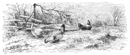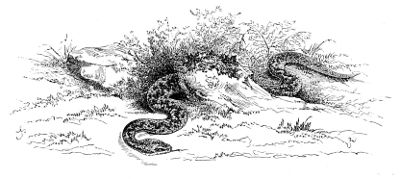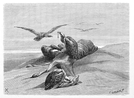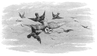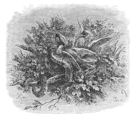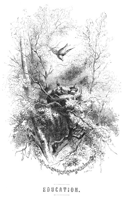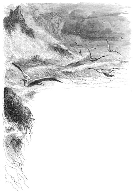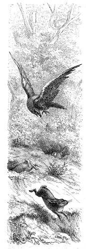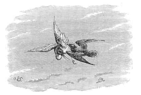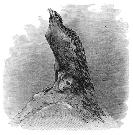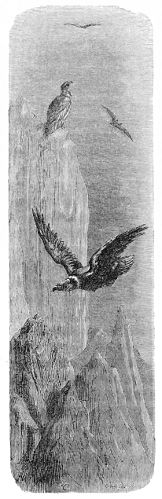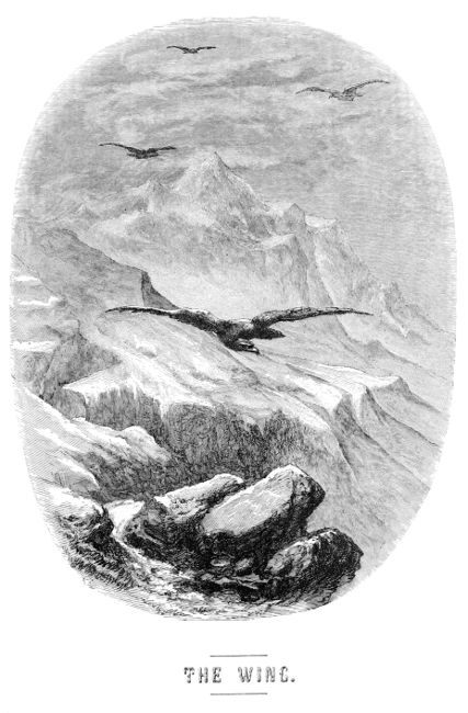 Page 273. Still the little one hesitates, &c.—"One day I was walking with my son in the neighbourhood of Montier. We perceived towards the north, on the Little Salève, an eagle emerging from the [Pg 338] windings of the rocks. When he was tolerably near the Great Salève he halted, and two eaglets, which he had carried on his back, attempted to fly, at first very close to their teacher, and in narrow circles; then, a few minutes afterwards, feeling fatigued, they returned to rest upon his back. Gradually their essays were protracted, and at the close of the lesson the eaglets effected some much more important flights, still under the eyes of their teacher of gymnastics. After about an hour's occupation the two scholars resumed their post on the paternal back, and the eagle returned to the rock from which he had started." (M. Chenvières, of Geneva.)