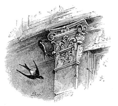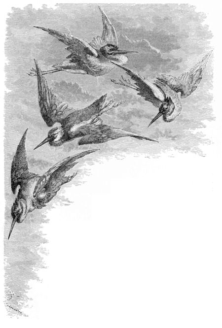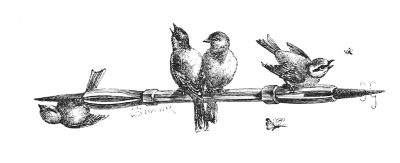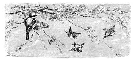 Many are the assiduous guardians of our herds. The heron garde-bœuf, making use of his bill as a lancet, cuts the flesh of the ox to extract from it a parasitical worm which sucks the blood and life of the animal. The wagtails and the starlings render very similar services to our cattle. The swallows destroy myriads of winged insects which never rest, and which we see dancing in the sun's rays; gnats, midges, flies. The goat-suckers and the martinets, twilight hunters, effect the disappearance of the cockchafers, the gnats, the moths, and a swarm of nibbling insects (rongeurs), which work only by night. The magpie hunts after the insects which, concealed beneath the bark of the tree, live upon its sap. The humming-bird, the fly-catcher, the soui-mangas, in tropical countries, purify the chalice of the flower. The bee-eater, in all lands, carries on a fierce hostility against the wasps which ruin our fruit. The goldfinch, partial to uncultivated soil and the seeds of the thistle, prevents the latter from spreading over the ground. Our garden birds, the chaffinches, blackcaps, blackbirds, tits, strip our fruit-bushes and great trees of the grubs, caterpillars, and beetles, whose ravages would be incalculable. A large number of these insects remain during winter in the egg or the larva, waiting for spring to burst into life; but in this state they are diligently hunted up by the mavis, the wren, the troglodyte. The former turn over the leaves which strew the earth; the latter climb to the loftiest branches, or clear out the trunk. In wet meadows, you may see the crows and storks boring the ground [Pg 332] to seize on the white worm (ver blanc) which, for three years before metamorphosing into a cockchafer, gnaws at the roots of our grasses.