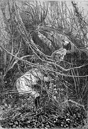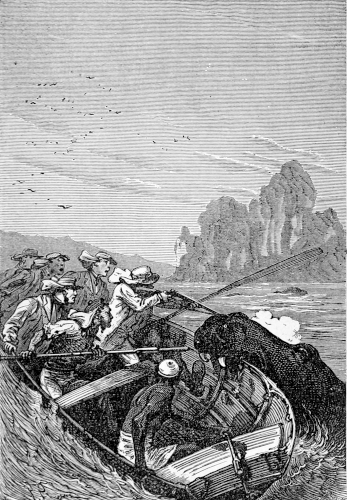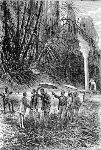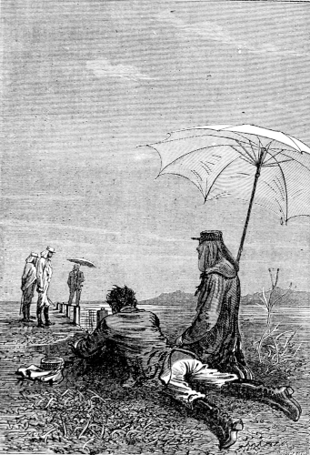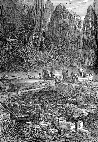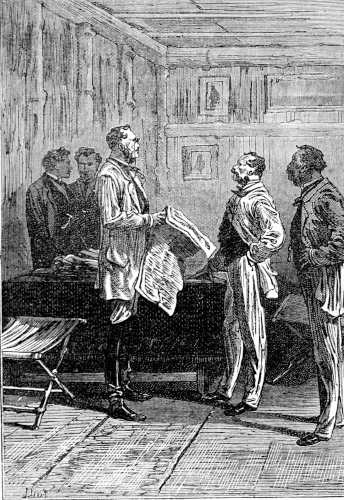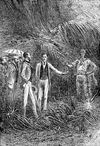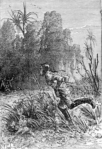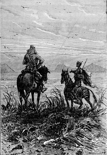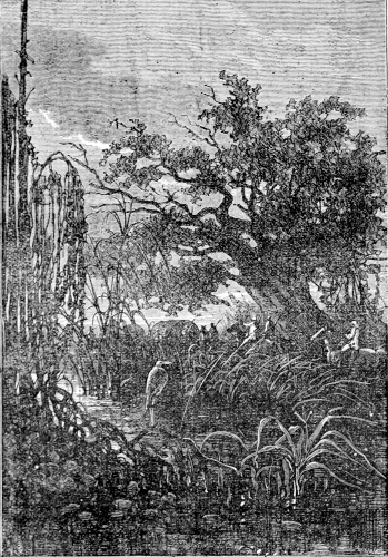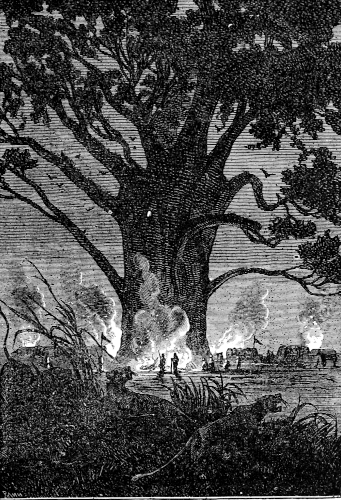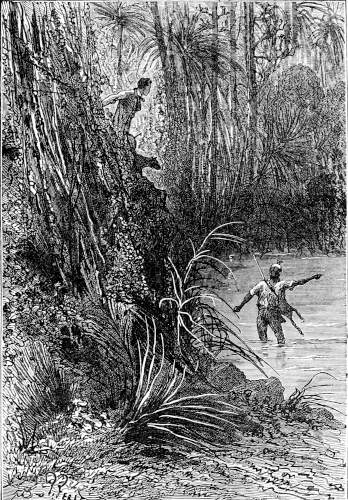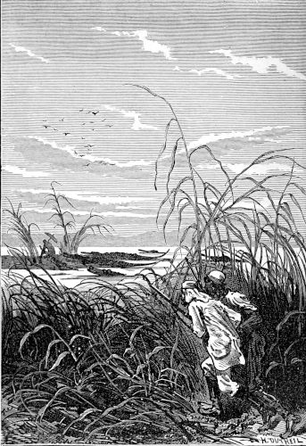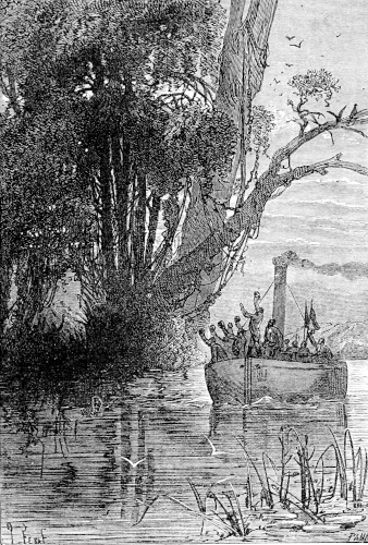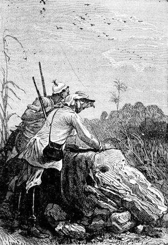 The young astronomer seated himself against a giant euphorbia, forty feet high, and in that position looked down the river, while the hunter, little used to sitting, continued to walk along the bank, and Top roused up clouds of wild birds, to which, however, his master gave no heed. They had been here about half an hour, when William Emery noticed that Mokoum, who was standing about 100 feet below him, gave signs of a closer attention. Was it likely that he had seen the long-expected boat? The astronomer, leaving his mossy couch, started for the spot where the hunter stood, and came up to him in a very few moments.