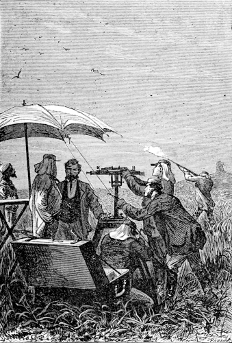 The hunter thought the astronomer's advice was good, and decided that he would go for a few hours and beat the neighbouring bushes and brushwood. Lions, hyenas, and leopards would not disturb such a Nimrod as he, so well accustomed to the African forests. He whistled to his dog Top, an animal of the hyena breed from the desert of Kalahari, and a descendant of that race of which the Balabas formerly made pointers. The intelligent creature, as impatient, seemingly, as his master, bounded up, and showed by his joyous barking how much he was gratified at the bushman's intention. Soon both man and dog disappeared among the thick masses of wood which crowned the background of the cataract. William Emery, now alone, again stretched himself at the foot of the willow, and while he was waiting for the heat to send him to sleep, began to think over his actual position. Here he was, far away from any inhabited spot, on the banks of the Orange river, a river as yet but little explored. He was waiting for Europeans, fellow-countrymen who had left their homes to run the risks of a distant expedition. But what was the expedition for? What scientific problem could it want to solve in the deserts of South Africa? What observation could it be trying to take in lat. 30° S.? That was just what Mr. Airy, the director of the Greenwich Observatory, did not tell in his letter. As for Emery himself, they asked for his co-operation as for that of a scientific man who was familiar with the climate of those southern latitudes, and as he was openly engaged in scientific labours, he was quite at the disposal of his colleagues in the United Kingdom.