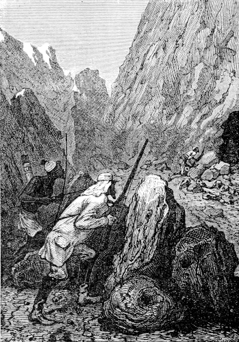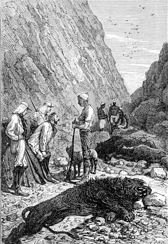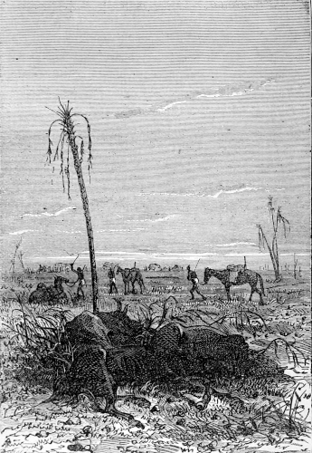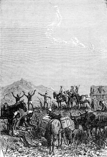 The hunter and the astronomer, lifting the beast by means of a pole placed across their shoulders, now left the head of the cataract, and in half an hour reached their encampment in a narrow gorge of the valley, where the waggon, guarded by two Bochjesman drivers, was waiting for them.